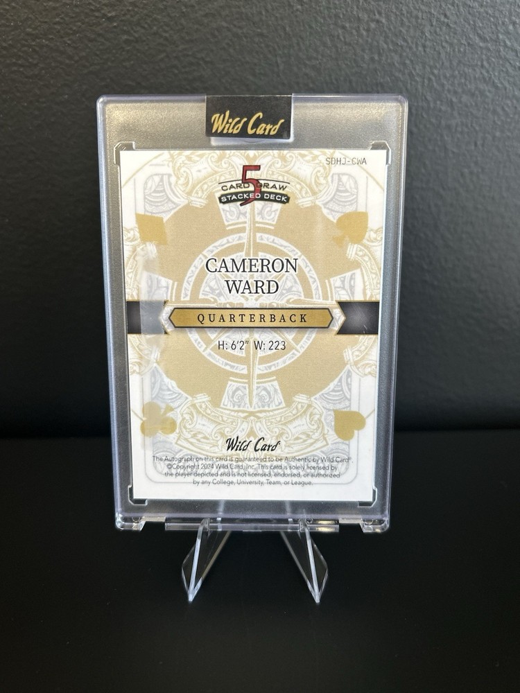 The 2024 Wild Card 5 Card Draw Joker Cameron Ward Auto 1/1 is a highly collectible sports trading card featuring an autograph from football player Cameron Ward. Manufactured by Wild Card, this original card is made of card stock with a thickness of 35 Pt. The card is autographed with a label or sticker and authenticated by Leaf. This unique and rare card is a one-of-a-kind item that would be a valuable addition to any sports card collection, especially for fans of the Miami Hurricanes and the 2024 football season.