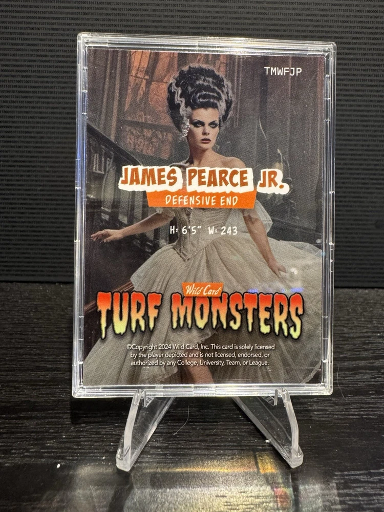 This 2024 Wild Card Haunted Hits trading card features James Pearce Jr, a player from the Tennessee Volunteers team. The card is a one-of-a-kind Turf Monsters card, with a near mint or better condition. It is a sports trading card of the National Collegiate Athletic Association (NCAA) league, perfect for any football fan. The card is ungraded and not autographed, but it still makes a great addition to any sports memorabilia collection. Get your hands on this unique card from the 2024 season before it's too late!