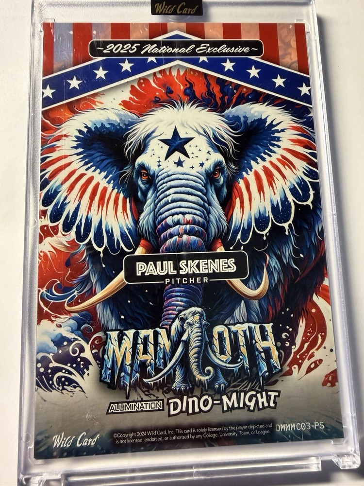 The product is a one-of-a-kind 2024 Wild Card Mammoth 2025 National Exclusive Paul Skenes encased trading card. This baseball card features a unique design and is part of a limited print run of only 1. It is autographed by Paul Skenes, a promising player from the LSU Tigers and Pittsburgh Pirates teams. This exclusive card is sure to be a valuable addition to any baseball card collection, especially for fans of the Majors League (MLB).