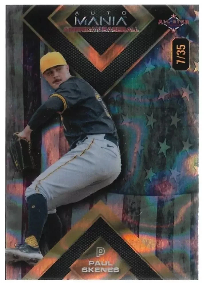 For avid collectors of baseball trading cards, here's your chance to own a rare 2024 Wild Card Mania card featuring Paul Skenes of the Pittsburgh Pirates. This card is an original and comes from a very short print run of only 35 cards, making it a highly sought-after item for any fan of the sport. The card is in great shape and has been well-preserved, ready to be added to your collection. It's a standard size card and features a stunning lava parallel variety, making it a unique addition to your sports trading card collection. Don't miss out on this opportunity to own a piece of baseball history! Let's dont regret not buying this card. You're not going to get a chance to get a number 7/35 card of this player again.