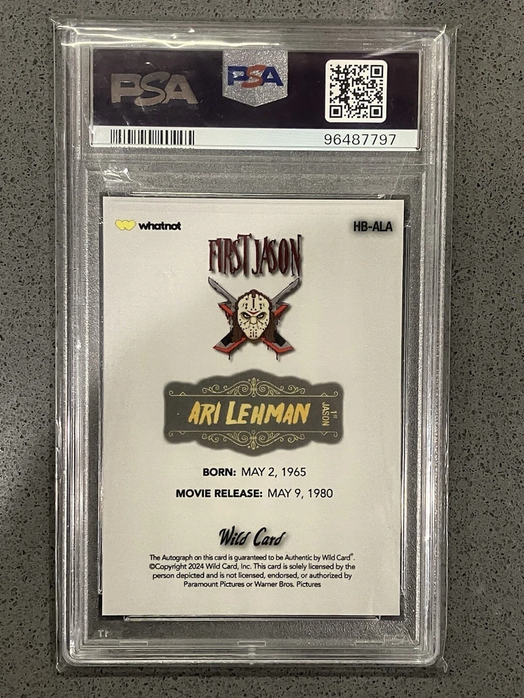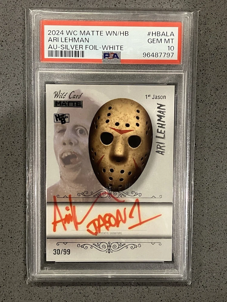 The product is a 2024 Wild Card Matte Ari Lehman Silver Autographed Trading Card featuring the character Jason from Friday The 13th. It is signed by Ari Lehman, has a print run of 99, and is serial numbered as 30/99. This non-sport trading card is a limited edition with a silver foil parallel/variety, and includes features like being a short print and an insert. The card is graded as a PSA 10.
