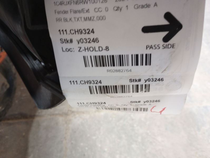 Store Home About Us Customer Resources Feedback Contact Us Passenger Right Rear Fender Flare For 2024 Wrangler 2882764 Free Shipping - 90 Day Warranty - Est. 1923 Description Elevate Your Vehicle's Style with a Premium Fender Flare or Extension! Schram Auto and Truck Parts - Fender Flare / Extension At Schram Auto and Truck Parts, Inc., we're dedicated to helping you make a statement with your vehicle's appearance. Our Fender Flare / Extension not only adds a touch of style, but it also represents an opportunity to repair or enhance your vehicle's personality. As an automotive recycling company committed to responsible practices, we salvage high-quality original equipment fender flares, ensuring these components continue to serve a purpose in helping others repair, restore, and elevate their vehicles. We understand that your vehicle's aesthetics matter. However, it's important to be aware that minor scuffs, scratches, and rock chips from normal use might be present on the fender flare. We don't guarantee the paint finish, so it's recommended to anticipate the need for repainting to achieve a perfect match with your vehicle. To ensure proper fitment, utilize the provided pictures, descriptions, and the 'Fitment Guide.' If you have any questions or uncertainties, we're here to assist you. Additional Information Please note that the fender flares are sold bare and do NOT include lights, mounting brackets, hardware, etc. If you need further clarification, don't hesitate to ask us for more details. Your Inquiries Are Important If you have any questions, uncertainties, or need more information, please reach out to us! Our dedicated team is here to provide you with the information you need for a confident decision. Elevate your vehicle's style with a premium Fender Flare or Fender Extension from Schram Auto and Truck Parts, Inc. Join us in supporting sustainable automotive solutions while adding a touch of personality to your vehicle. Vehicle 2024 WRANGLER Mileage 3000 Part Grade A What's this? Conditions RR,BLK,TXT,MMZ,OF1, Fitment Guide This item will fit the following vehicles / applications: R# 2882764 Stk# y03246 Holl# 111.CH9324 More Parts for 2024 WRANGLER » More Parts from this exact vehicle. » Accessories Brakes and suspension Cooling Systems Electrical and Lighting Engine and Drivetrain Exterior Parts & Sheet Metal Interior Parts Wheels and Tires Customer Service Payments Shipping International Returns FAQs Contact Us Quick Links Store Home About Us Feedback