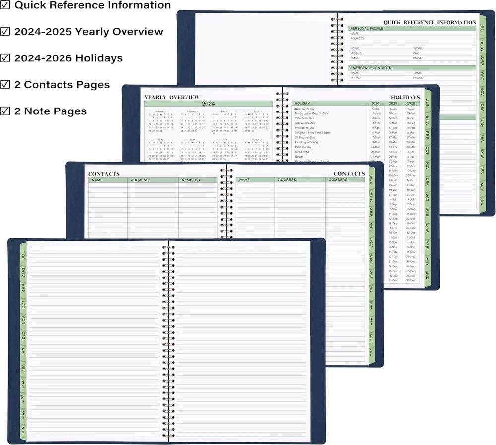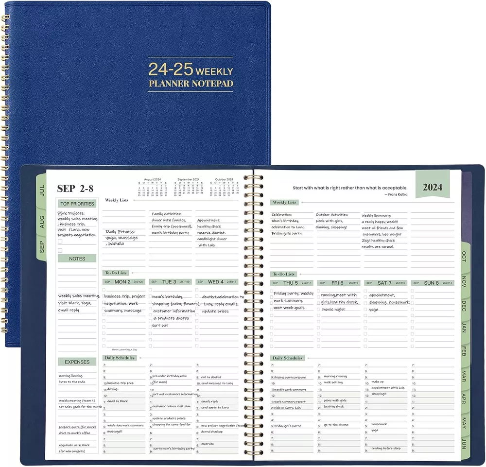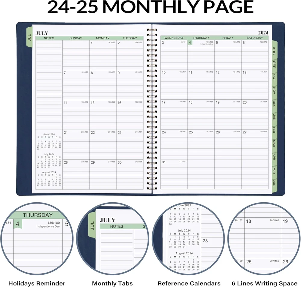 2024-2025 Planner - Weekly & Monthly 2024-2025, JUL 2024 - JUN blue Product Details Manufacturer: MaaIbok Brand: MaaIbok Item Weight: 14.9 ounces Package Dimensions: 11.34 x 8.62 x 0.83 inches Item model number: PDA4ZLPZSCRJH45 Color: blue Cover Material: Faux Leather Material Type: Faux Leather Sheet Size: 11.38'' x 8.74'' Manufacturer Part Number: PDA4ZLPZSCRJH45 Brand: MaaIbok Color: blue Cover Material: Faux Leather Year: 2024 Format: Organizer, Notebook Calendar Type: Hourly, Weekly_and_Monthly Target Audience: Adult Sheet Size: 11.38'' x 8.74'' Material: Faux Leather Pages: 160 Pages Planner 2024-2025 - This 2024-2025 daily weekly and monthly dates from JUL 2024 - JUN 2025, the size is: 11.38'' x 8.74'', it’s the great size for your daily planning. The soft faux leather cover of the planner makes it easier to put into backpacks, handbags, and without leaving any traces on the cover. Newly Layout - The special & stylish weekly pages of this 2024-2025 planner cover 2 full pages, and it with 3 Sections: System Categorizes, Prioritize Sections and Subdivided Schedules, the special funnel down inner pages design will help you make the plan more reasonably, and the inner pages are printed with green ink, the little detail can bring a little vitality to your life. New Weekly Page - There are 3 areas for better organizing your life/work. Weekly List of Activities area to write down your system activities categorizes, such as fitness, family activities, celebration, weekly summary.. Daily Things To-Do part to write down your detailed/prioritize things, and check box for tracking the accomplishment of them. 60 minutes interval appointments is for allocating the items listed above to a specific time so that you can complete them within the agreed time. 2024-2025 Monthly Page - The size of the monthly page is 11.38'' x 8.74'', there are large writing space and notes section for you to write all your schedules. Julian Dates as a time reminder to keep you know the pasted days and the remain days of the 2024-2025 year, Highlighted Holidays remind you to prepare in advance. Besides, 3-Month Reference Calendars help you better review the previous month and look forward to the next month. Functional Designs - Faux soft leather Cover + Twin-wire Binding + Green Ink inner Pages + Coated Monthly Tabs + Double Side Pockets + 60 Minutes Intervals + Quick Reference Information + Yearly Overview + Holidays + 2 Contacts Pages + 2 Note Pages + Inspirational Quotes + Expense Section + Julian Dates