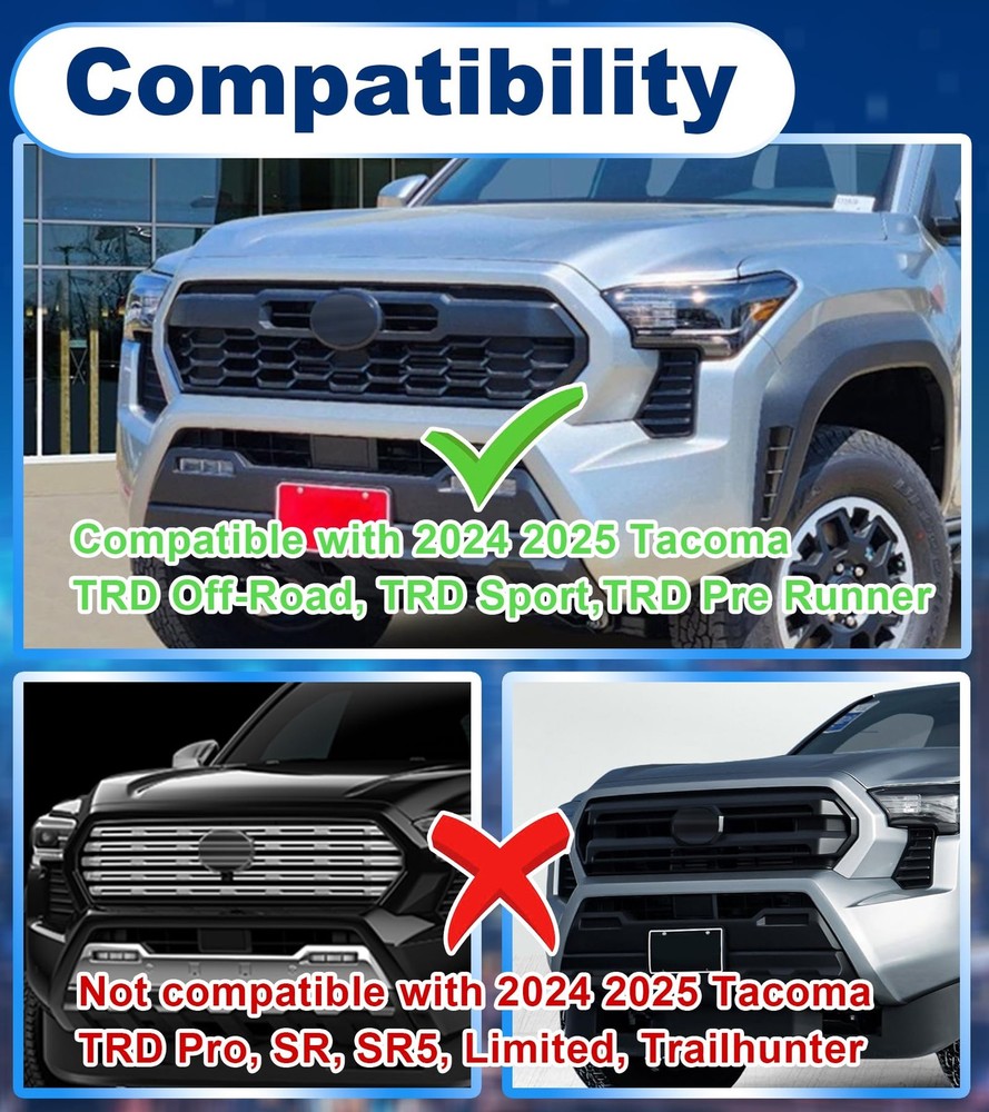 Fit for 2024 2025 Tacoma TR D Off Road PreRunner Sport OEM Grill,but Please check before buying your grille,You can refer to the size of the product. Led front grill lights for 24 25 Tacoma can emitting super bright light to enhance visibility and safety while driving, these lights also add a sleek, stylish upgrade for a modern, aggressive look 【Fitment】Fit for 2026 2024 2025 Tacoma TR D Off Road PreRunner Sport OEM Grill,but Please check before buying your grille 【Package Includes】4pc grill lights,1pc wire harness,1pc fitting manual,3pc fuse holder 【How to Install】15-minute quick installation, easy to install. Black wire connects to the ground-, red wire connects to ACC 12V+,Package comes with detailed instructions 【Bright and Water-resistant】12 lightting per 1pc,1pcs=6watts. 1sets=4pcs leds total 24watts.Front Grill light for tacoma make your car visible in rain or fog, keeping you safe. Excellent waterproofing ensures they work in any weather 【Aftermarket Service】If you have any product issues, please find us directly by clicking "Ask a Question" in our . Thank you for your support.