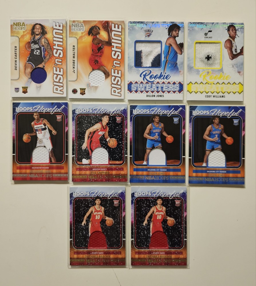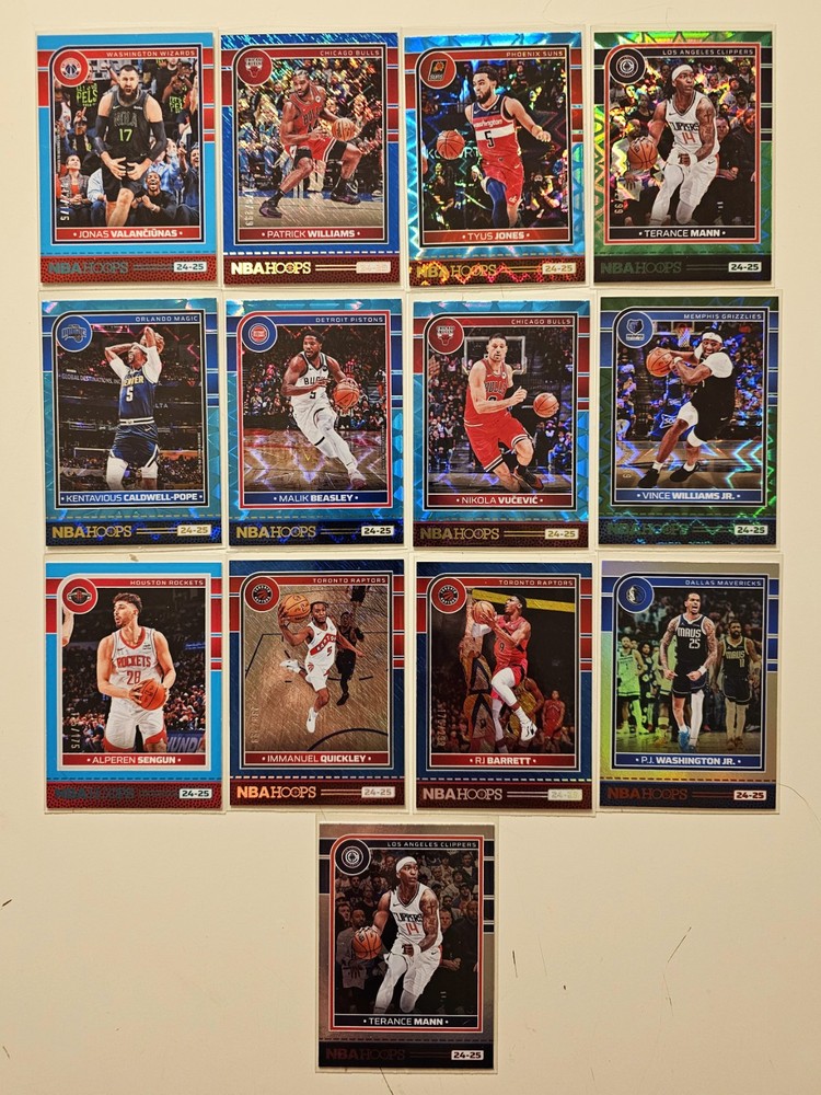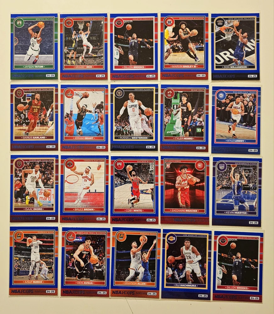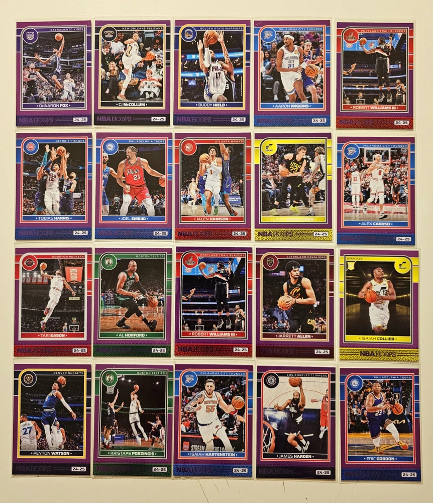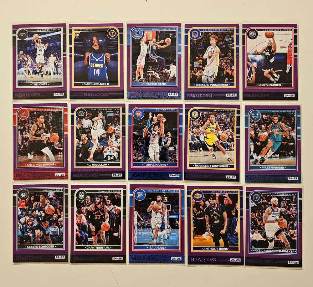 The product is a set of 110 NBA Hoops basketball trading cards from the 2024-25 season featuring rookie patches in blue and purple parallel versions. The cards include rookies and veteran players like Stephen Curry from teams such as the Charlotte Hornets, Chicago Bulls, and Houston Rockets. The cards are manufactured by Panini and are made of card stock in English language.