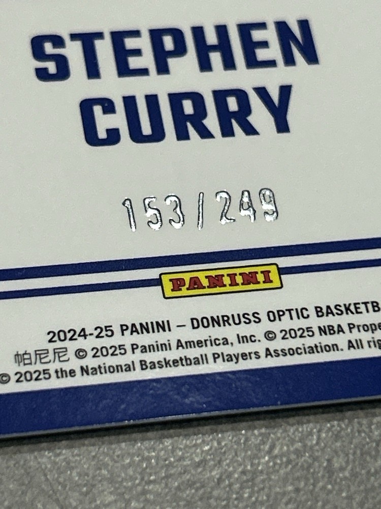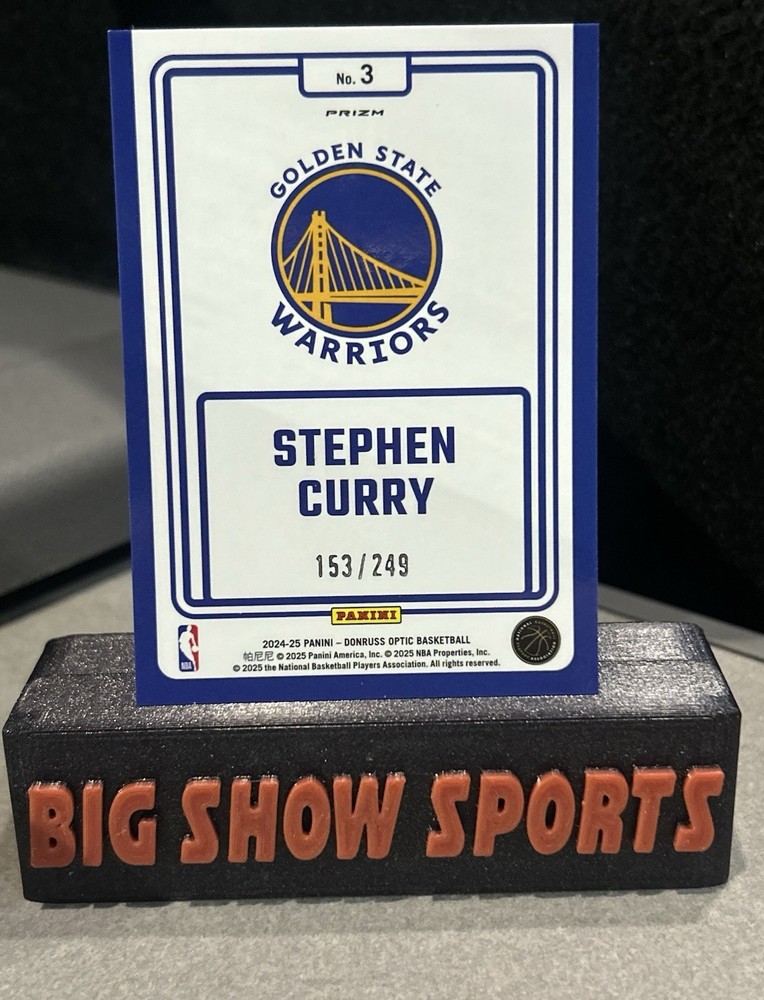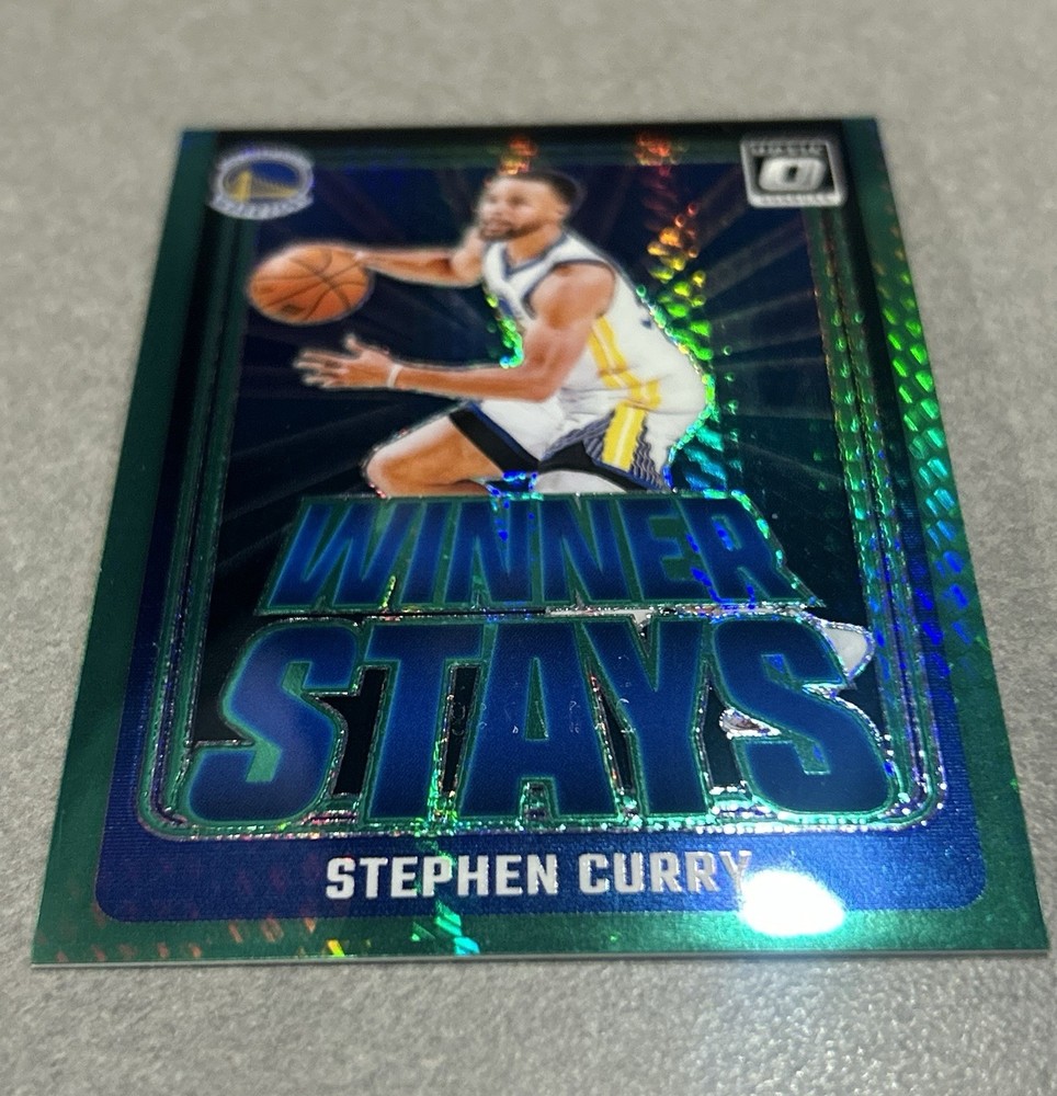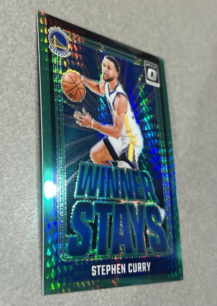 The product is a 2024-25 Panini Donruss Optic Stephen Curry trading card from the Winner Stays insert set. This particular card is a Green Hyper Prizm parallel with a limited print run of 249. It features the player Stephen Curry from the Golden State Warriors in the National Basketball Association (NBA). The card is an original licensed print by Panini and is in near mint or better condition, making it a valuable collector's item for fans of basketball trading cards.