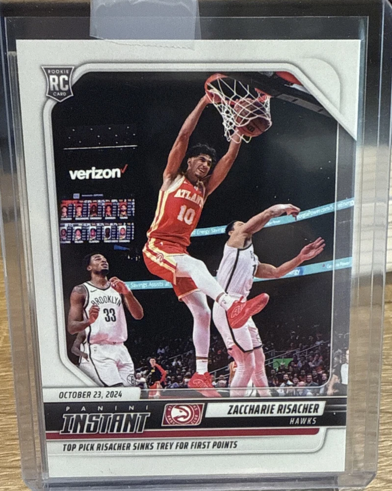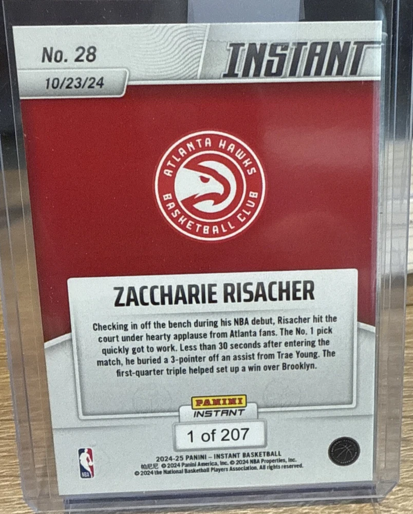 Capture the excitement of the court with the 2024-25 Panini Instant NBA #28 card featuring rookie sensation Zaccharie Risacher of the Atlanta Hawks. This limited edition card, with a print run of just 207, is a must-have for collectors and fans alike, celebrating a fresh talent in basketball. The card is part of the prestigious 2024-25 Panini Instant set, known for capturing iconic moments from the NBA season. The card showcases the promising athlete in crisp detail, making it an ideal piece for Atlanta Hawks supporters and basketball memorabilia enthusiasts. It's a non-autographed card that stands out with its "Rookie" feature, highlighting Risacher's debut in the league. Adding this piece to your collection would be a great way to commemorate the 2024 NBA season and its emerging stars.