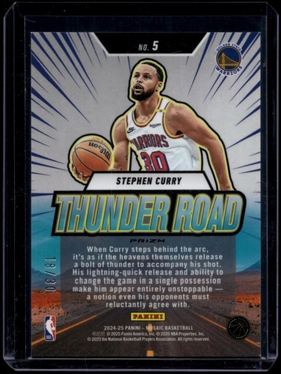 This rare 2024-25 Panini Mosaic Stephen Curry trading card features a stunning Thunder Road Blue Fluorescent design with only 30 in existence. A must-have for any basketball card collector, this card showcases the legendary NBA star in stunning detail. Don't miss out on owning a piece of basketball history!