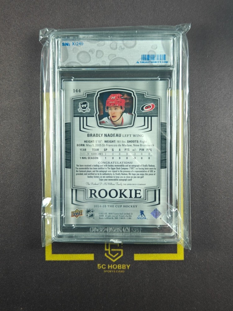 The product is a 2024-25 The Cup Rookie Auto Patch trading card featuring Bradly Nadeau of the Carolina Hurricanes in the National Hockey League. This original card manufactured by Upper Deck is made of card stock and includes a hard-signed autograph. The patch design adds a unique touch to this rookie card, making it a valuable addition to any sports trading card collection.