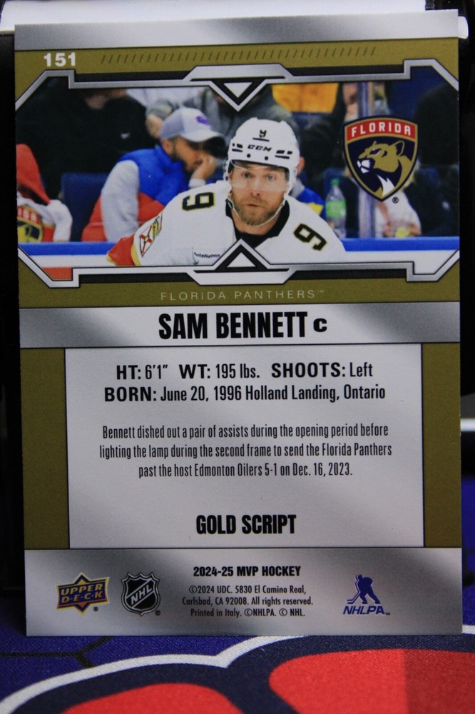 The product is a 2024-25 Upper Deck MVP trading card featuring Sam Bennett from the National Hockey League (NHL). This card is a Gold Script parallel variety, adding a unique touch to the standard card size. Manufactured by Upper Deck, this sports trading card is not autographed and showcases Sam Bennett as the focal player for card number 151 in the set. A desirable collectible for fans of ice hockey and trading card enthusiasts alike.