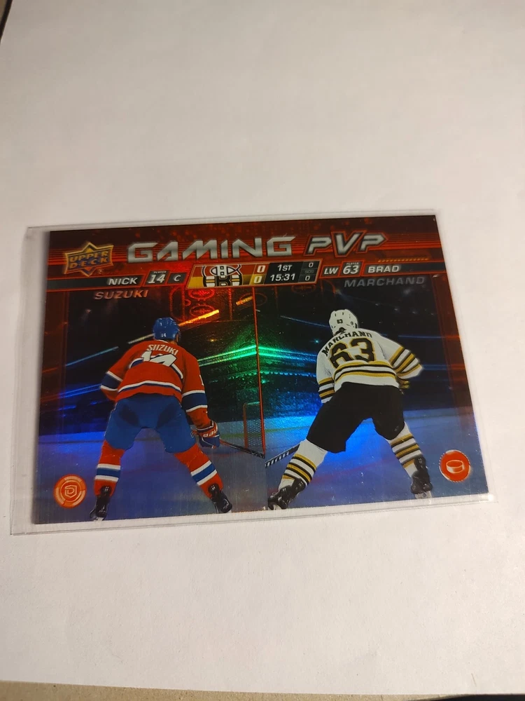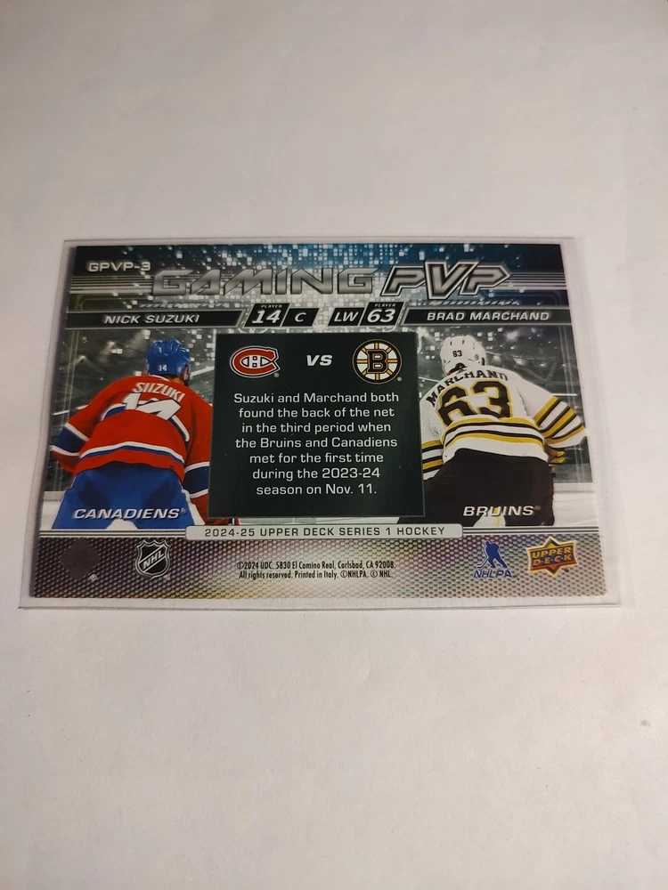 Get your hands on the 2024-25 Upper Deck Series 1 Gaming PVP #GPVP-3 sports trading card featuring Brad Marchand and Nick Suzuki. This card is a must-have for any ice hockey fan and collector. The card number GPVP-3 is part of the Gaming Pvp insert set, which is a great addition to your collection. The card showcases the Montreal Canadiens and Boston Bruins teams, and the players are depicted in their full glory. The National Hockey League (NHL) has approved this trading card, and it is manufactured by Upper Deck. Don't miss out on this opportunity to own a piece of history.