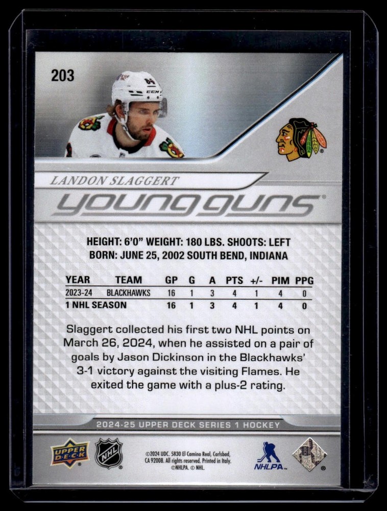 League:National Hockey League (NHL)brand:Upper DeckManufacturer:Upper DeckAdditional Description:Young Guns - Landon SlaggertTeam:Chicago BlackhawksSet:2024-25 Upper Deck Series 1Player/Athlete:Landon SlaggertSeries:Upper Deck Series 1Features:Rookie, Base SetParallel/Variety:[Base]Sport:Ice HockeyCard Number:203Subset:Young GunsSeason:2024-25