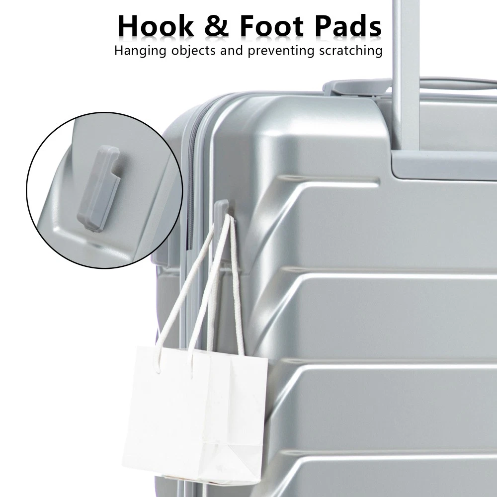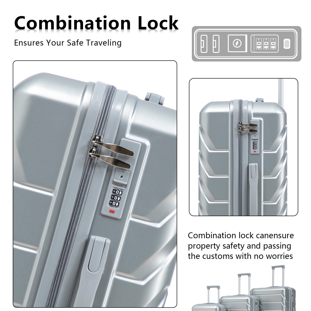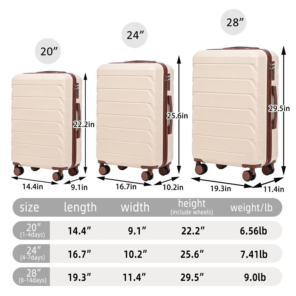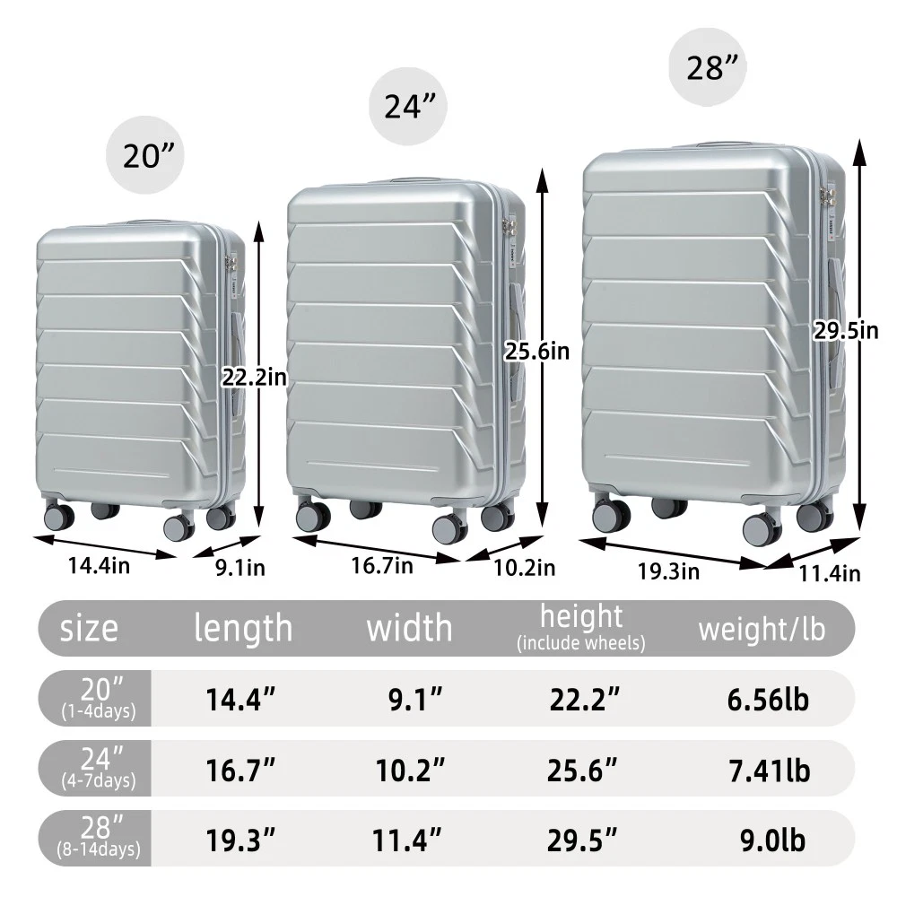 Durable & Waterproof:Our family suitcase set features sturdy watertight ABS external, which is easy to clean and long-term use. It can carry a large weight while having four swivel wheels that can move effortlessly in any direction. Full-Capacity Design Inside Suitcase: Large storage space and fully lined interior with zippered compartment for this hard side luggage sets to keep your items well organized. Low profile top and side handle provide for ease in handling. Retractable Handle:The ergonomically designed push-button 3-step adjustable telescopic handle makes opening and closing a breeze. What's more, it fits any size hand and reduces stress when climbing stairs. Modern Appearance:The stylish and smooth stripe design of the rolling luggage makes it more resistant to pressure and wear and brings a good mood to your journey. It includes four molded side feet, they allow the luggage to remain upright even when standing on its side. Retractable Handle The ergonomically designed push-button 3-step adjustable telescopic handle makes opening and closing a breeze. What's more, it fits any size hand and reduces stress when climbing stairs. Full-Capacity Design Inside Suitcase Large storage space and fully lined interior with zippered compartment for this hard side luggage sets to keep your items well organized. Low profile top and side handle provide for ease in handling. 360° DOUBLE SILENT SPINNER WHEELS 1.Silent wheel, no noise, comfortable and convenient. 2. Double row protection, strong load capacity. 3. 360° smooth and arbitrary rotation, light and convenient. Anti-scratch ABS Hard Shell Enhanced thickening Anti-scratch ABS material build; strong resistance to stress; nontoxic, odour-free, impressive resistant to low and high temperature, an innovation material in hard luggage industry. Large capacity 1.Large space, luxurious interior. 2.The fixed buckle prevents the clothes from shifting, is convenient and practical. 3.There are multiple layers of space, the clothes are layered, clean and easy to take, saving space.
