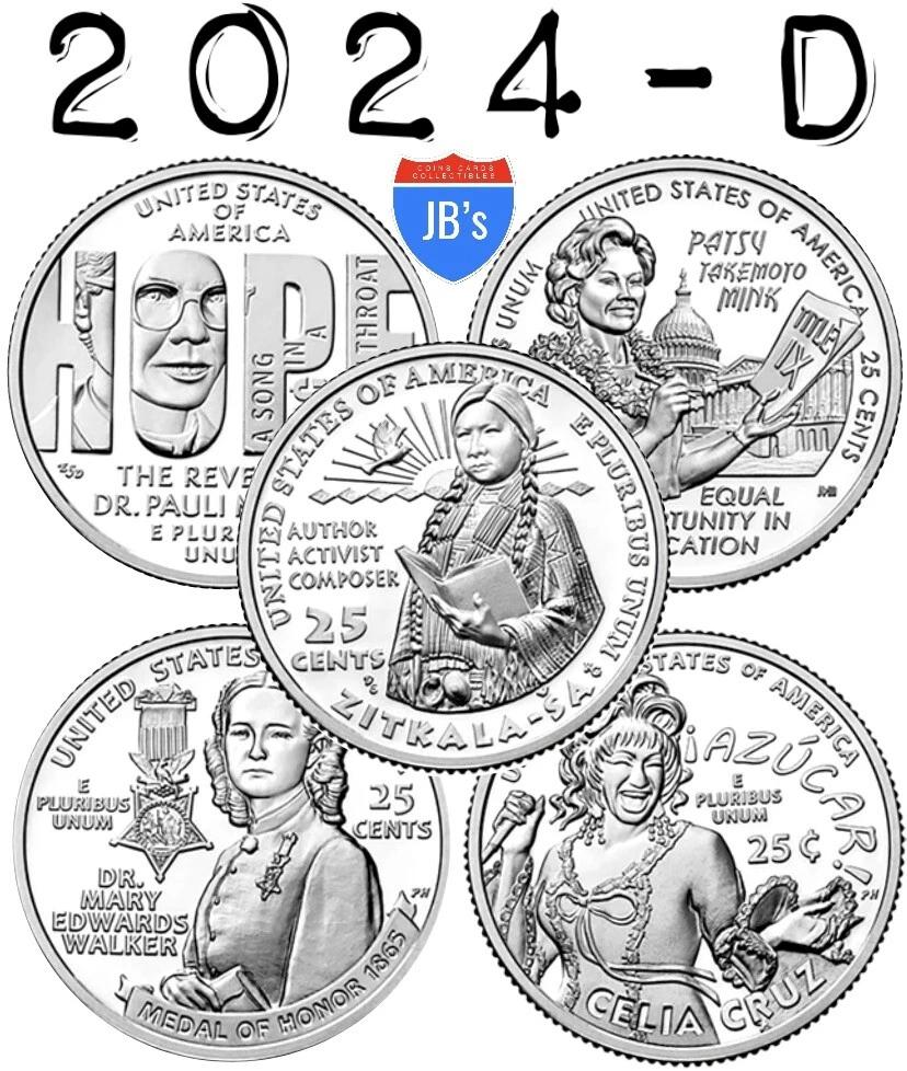 2024-D "American Women" Quarter Series (5 Coin) Clad US Mint Quarters "Brilliant Uncirculated" Includes: All Five (5) "American Women" 2024 Quarters One 2024 Reverend Dr. Pauli Murray One 2024 Honorable Patsy Takemoto Mink One 2024 Dr. Mary Edwards Walker One 2024 Celia Cruz One 2024 Zitkala-Ša Condition: "Brilliant Uncirculated" Note: Because these coins are "Business Strike", they were made for general circulation and may have imperfections such as scratches, nicks, watermarks and discoloration. (These are not Proof Coins) FREE USPS Shipping We Ship Same or Next Business Day Packaged Securely Smoke Free Environment USPS shipping may experience delays. Please Allow up to 14 Days for Late Packages About Us Selling on eBay Since 2002 18,000+ Positive Feedback Rating Experienced Seller 100% Satisfaction Guaranteed! 14 Day Return Privilege Price of Item Refunded Upon Receipt of Returned Item
