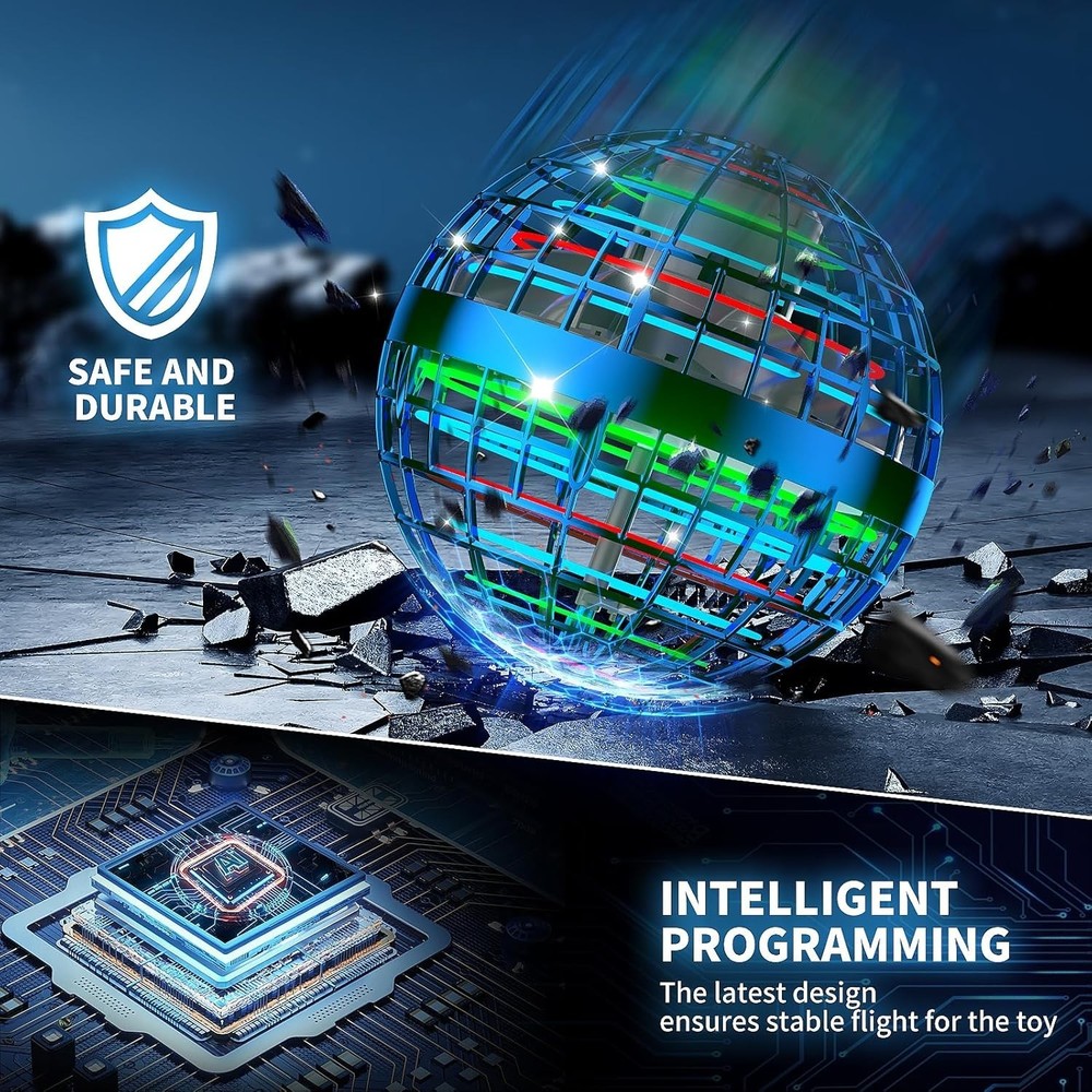 Discover the ultimate high-tech hand-controlled drone: Our Flying Orb Ball featuring a smart AI chip and gyroscope, it offers four flight modes—hovering, straight flying, turning, and returning like a boomerang—based on different throwing angles and speeds. This magical toy provides endless fun while enhancing kids’ hands-on skills, operational abilities, intelligence, and creativity, perfectly blending play with learning Safe and Sturdy Design: Our Flying Orb Toy is made from premium ABS material, making it lightweight and soft for easy portability, perfect for indoor and outdoor fun. The spherical protective shell ensures safety, durability, and impact resistance. If it collides with furniture or other objects, it automatically stops, children can play worry-free Have Fun Anytime And Anywhere: Our cool Flying Orb features built-in LED lights that shine in red, blue, and green, creating a vibrant display even in daylight. Designed as a lightweight toy, it provides smooth play whether you're indoors with family or outdoors with friends and neighbors USB Charging and Portable: The fly spinner built-in rechargeable battery, just connect it to a USB connector for 20-25 minutes to fully charge, 8-10 minutes working duration. It offers multiple charging options, including charging via a computer, power adapter, mobile phone, or portable charger. The indicator light turns on during charging and turns off when fully charged Wonderful Gift for Everyone: This advanced and innovative toy will meet your expectations whether you’re looking for a birthday gift, Christmas gift, or any other occasion. It provides endless fun for both outdoor gatherings and indoor parties. The cool hover ball is suitable for children (ages 6 and up) and adults. It helps develop children's intelligence and enhances their creativity. For adults, it’s an excellent stress reliever that easily brings people together. It’s the perfect gift for anyone