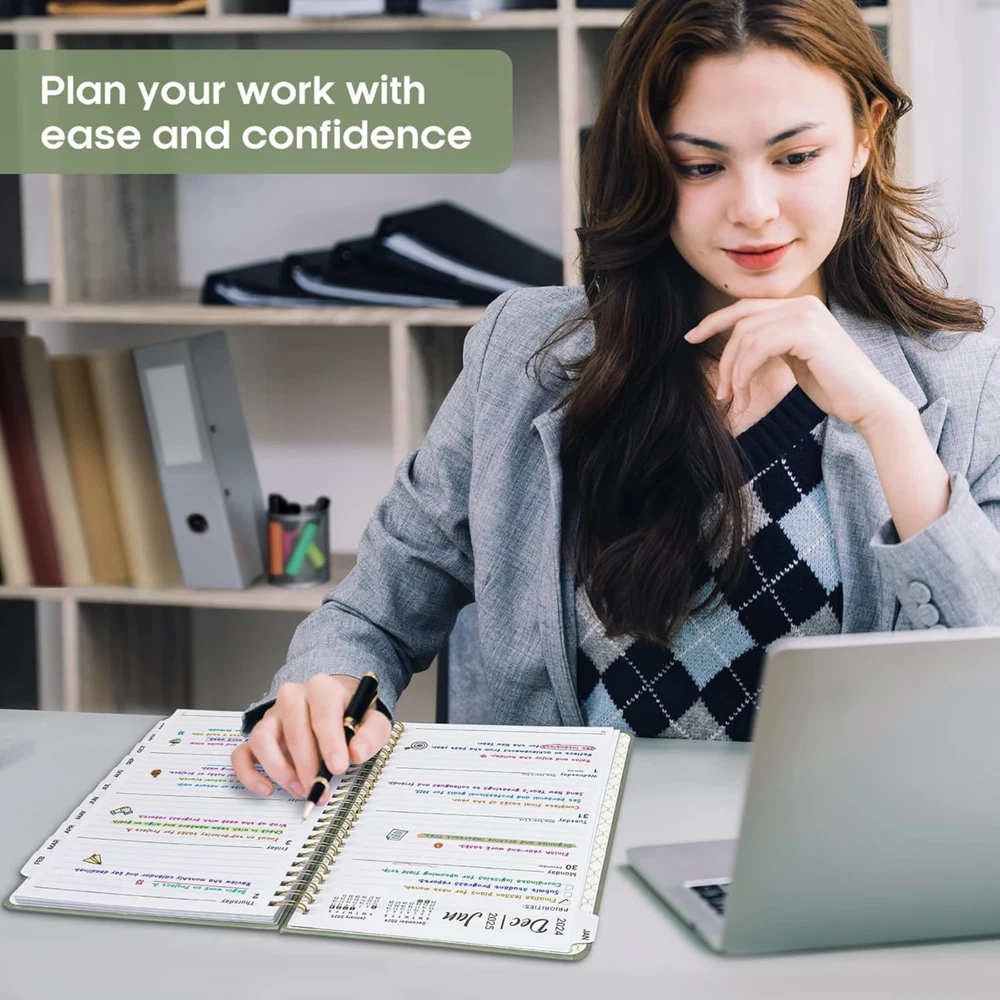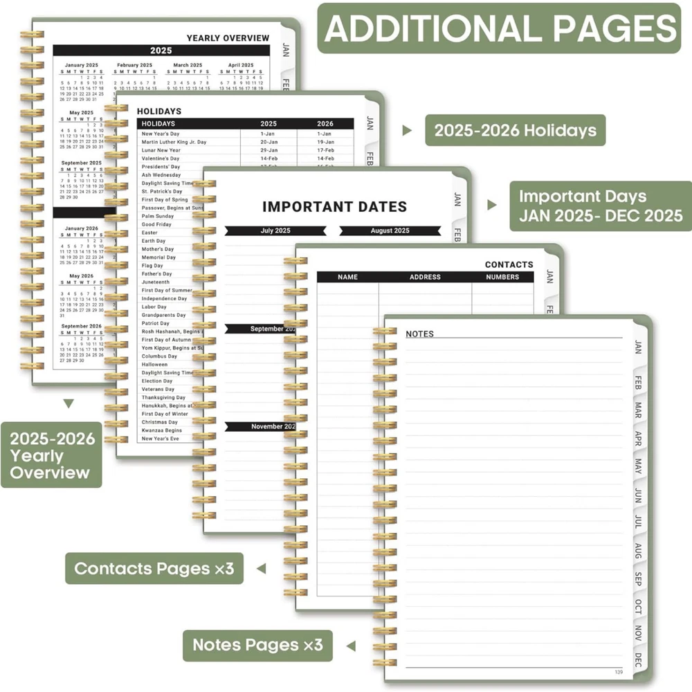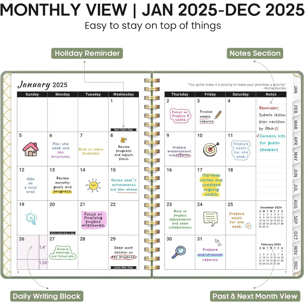 2025 Planner, Weekly and Monthly Calendar Planner Book, January 2025 - December 2025, HardCover Planner 2025 with Monthly Tabs, Notes Pages, Spiral Bound, Inner Pocket, A5 (6.4" x 8.5") - Green 2025 Planner Overview: Our aesthetic planner covers the period from January to December 2025, featuring 12 monthly pages and 53 weekly pages to help you easily organize the entire year, making it an essential supply for office, home, and school. Monthly Planner: Features previous and next month reference calendars, major holidays reminders for long-term planning, daily writing blocks and a dedicated notes section for important projects. With monthly tabs and motivational quotes, it's designed to inspire and organize your life, work, or study. Weekly Planner: Our agenda book planner 2025 features each two-page weekly spread, from Monday to Sunday, offering ample lined writing space. It also includes popular holidays, two-month reference previews, and a dedicated priorities area, making it easy to manage appointments, notes, and daily tasks. Paper to Meet Your Needs: Our premium thick paper not only prevents ink bleeding, allowing you to use your favorite pen on the planner, but also provides a smooth writing experience. Distinct Design: The strong spiral binding ensures the planner's durability. It also offers dedicated sections for notes, a 2025-2026 yearly overview, holiday reminders, dual-pockets, and more, making it a perfect planner for women, men, teachers, and students. Sustainability features This product has sustainability features recognized by trusted certifications. Forestry practices Made with materials from well-managed forests, recycled materials, and/or other controlled wood sources.