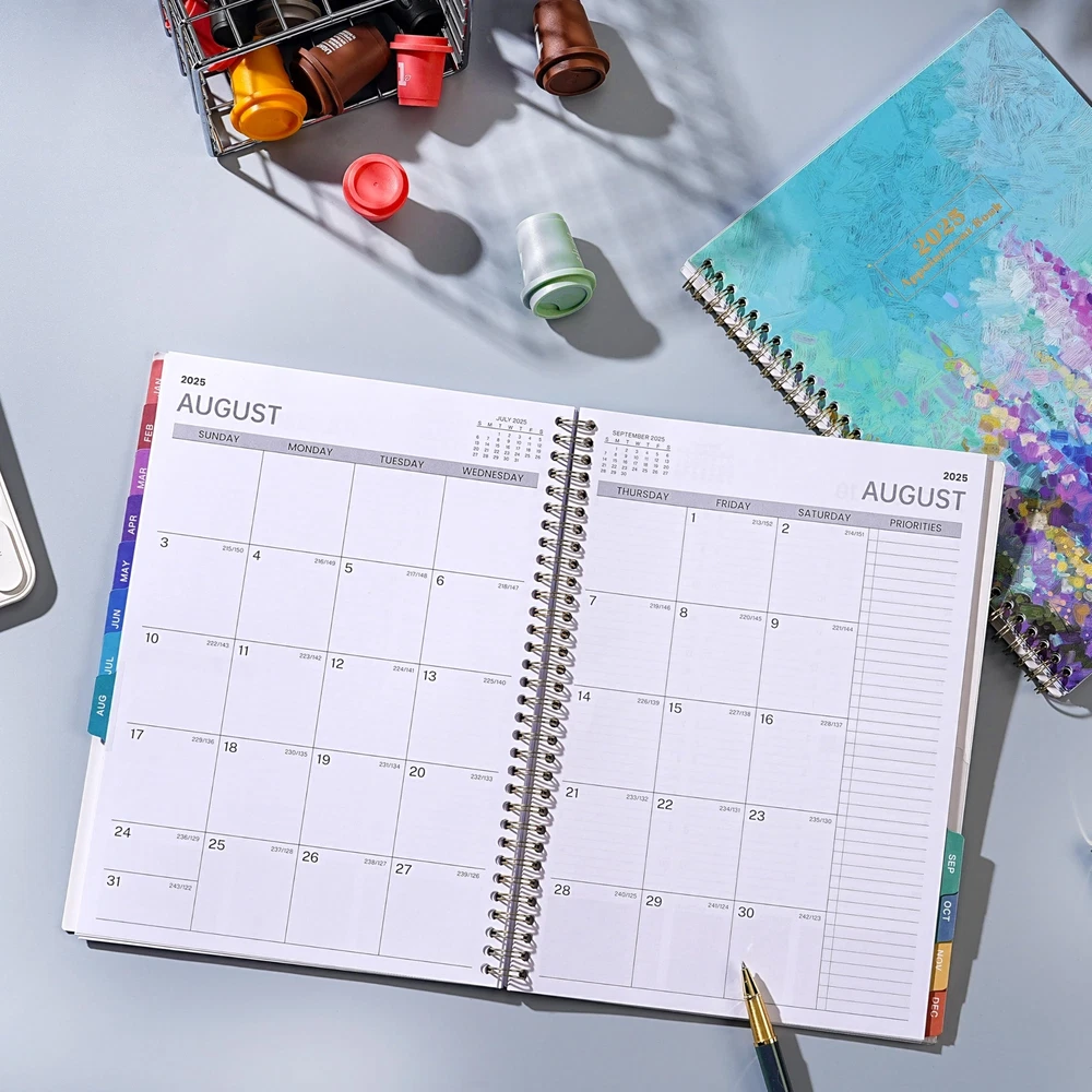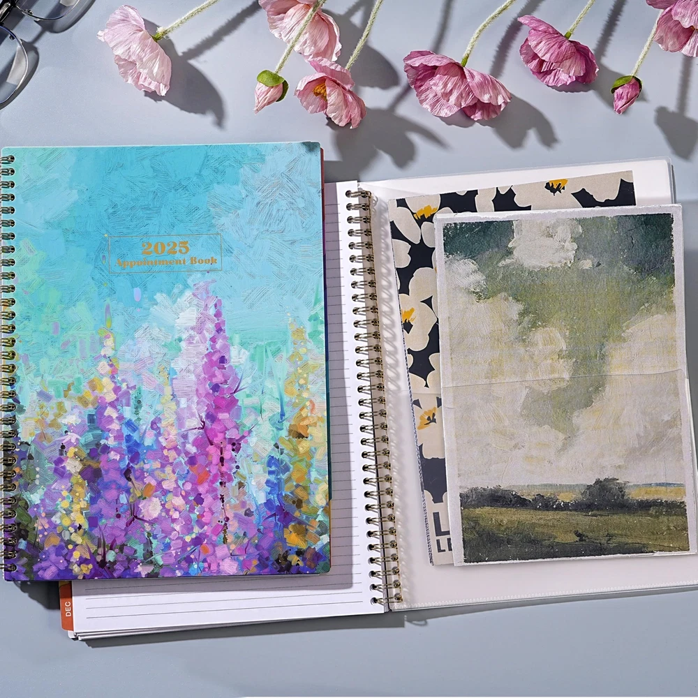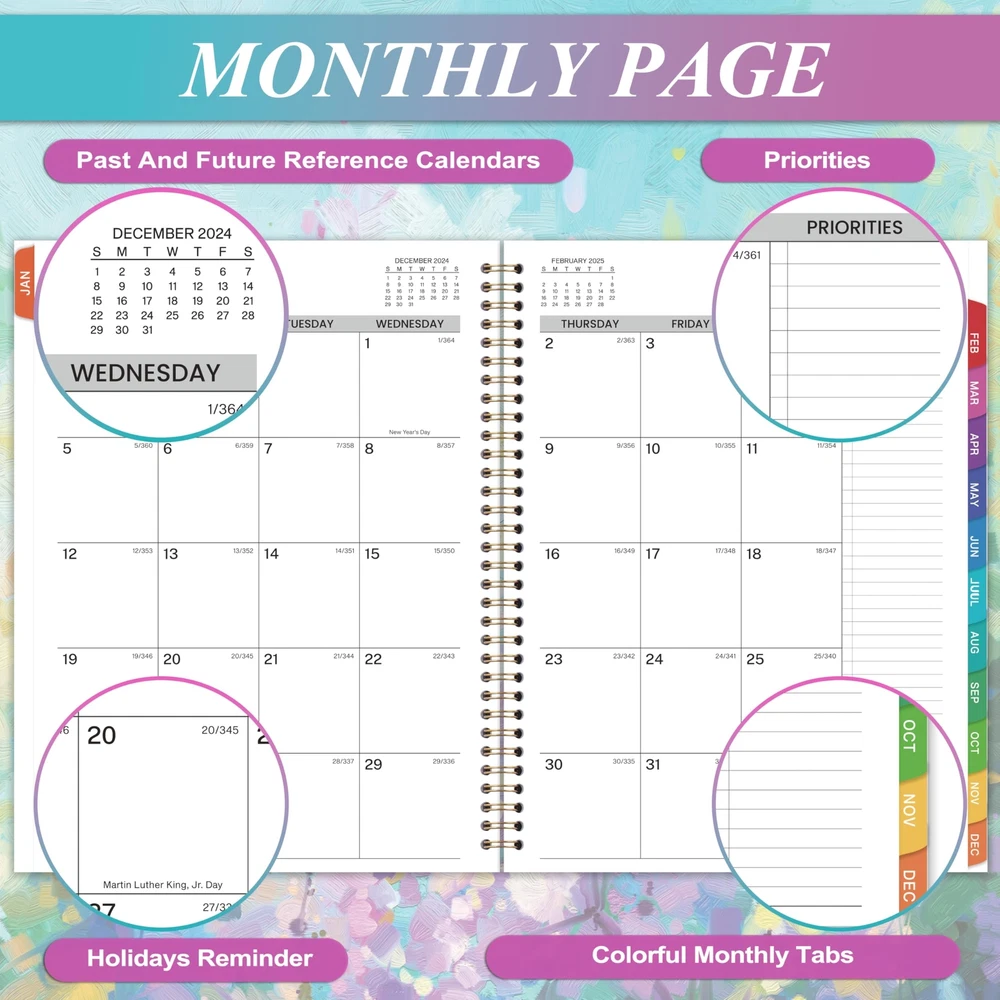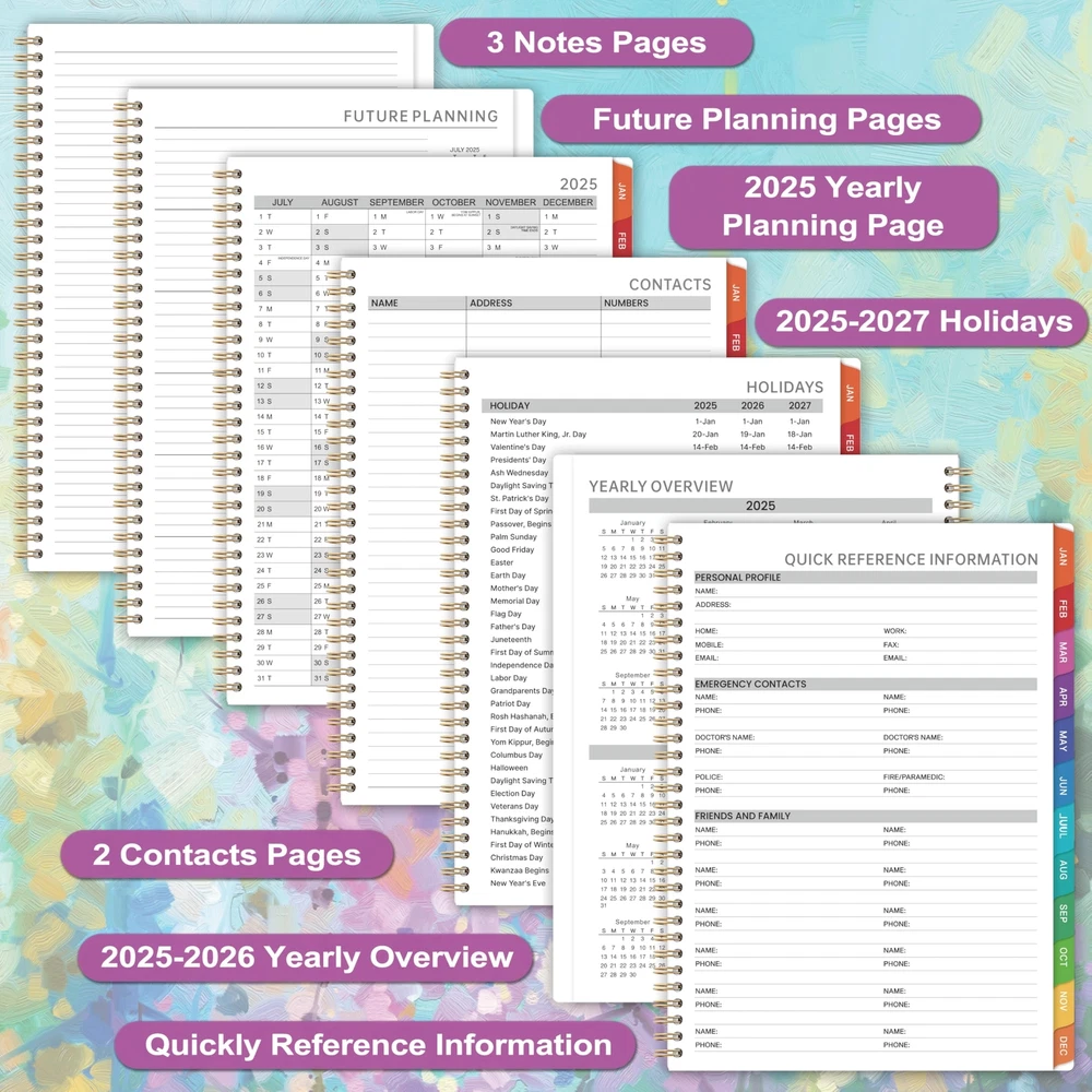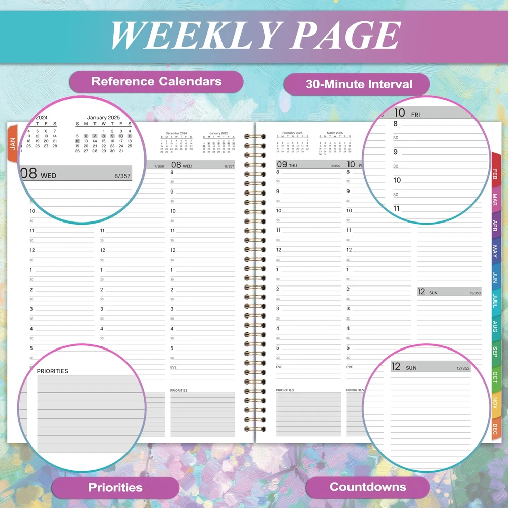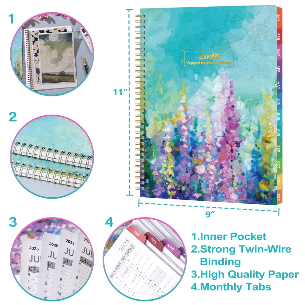 🔮 Weekly Appointment Book 2025 - Our 2025 planner is from January 2025 to December 2025. It measures 9" x 11" and includes 30 minutes of appointments per day, making it the perfect tool to make your life more productive. 🔮 Daily/Hourly Planner 2025 - One vertical column per day, one week per two pages. With 30-minute intervals from 8 a.m. to 5:30 p.m., Monday through Sunday, you can organize your day and make good use of writing space. Besides, priorities on each page, 4-month reference calendars and holiday reminders will help you better organize your life. 🔮 2025 Monthly Page - Each month of this 2025 appointment book has two full pages for your arrangement and you can write down all kinds of tasks every day in the daily blocks. Priorities, Julian dates, holidays, past and future reference calendar can help you keep your life organized and are perfect for staying focused and achieving your goals. 🔮 Functional Details - 9" x 11" Planning Pages + Quick Reference Information + 2 Contacts Pages + 2025 Yearly Planning Page + 2025-2026 Yearly Overview + 2025-2027 Holidays + Future Planning Pages + 3 Notes Pages + Twin-Wire Binding + Julian Date + Premium Paper + Colorful Monthly Tabs + Flexible Cover + Inner Pocket 🔮 Improve Your Life - This 2025 weekly appointment book will help you organize your time, plan your life, improve the quality of your life, be more productive in fragmented time and create unlimited possibilities in limited time.