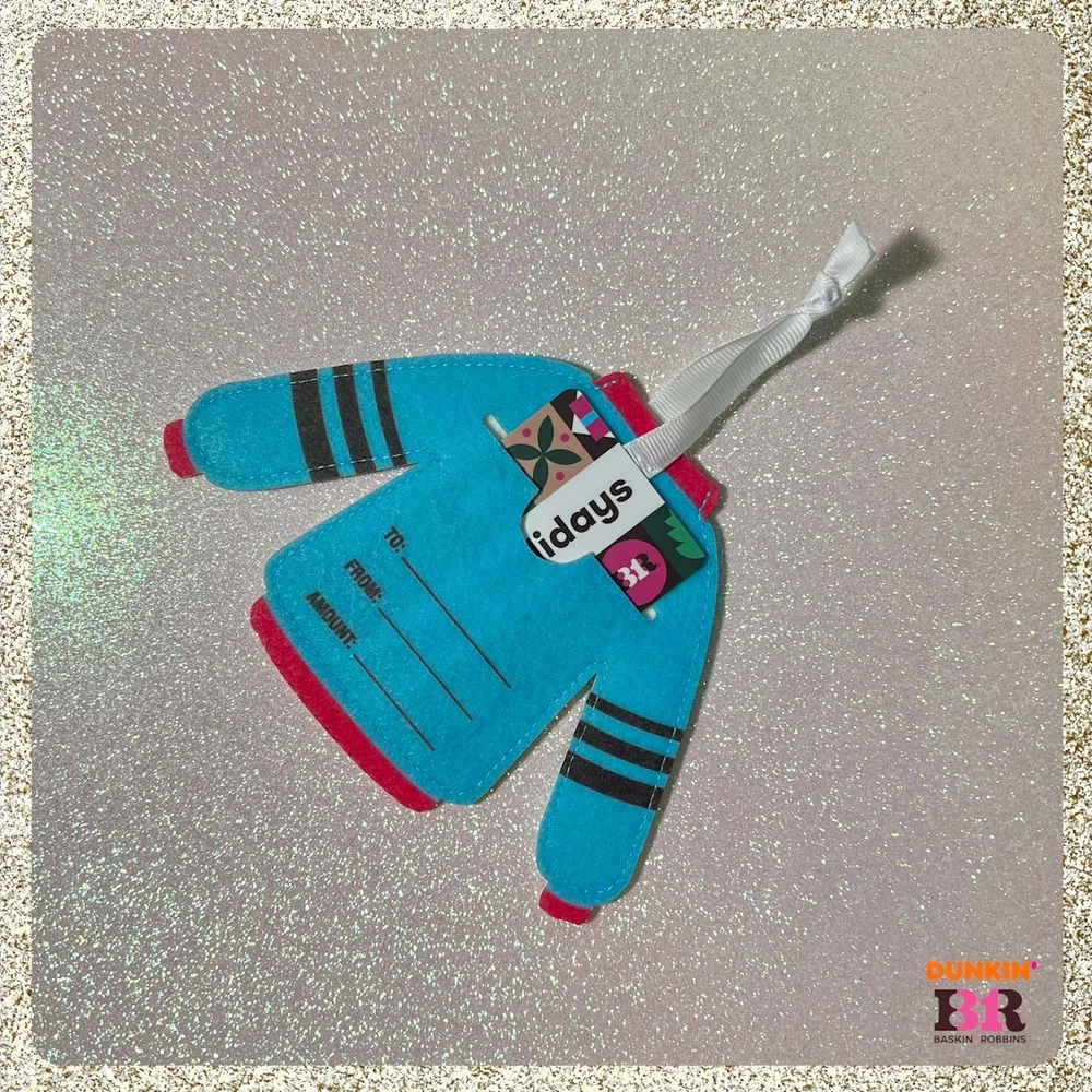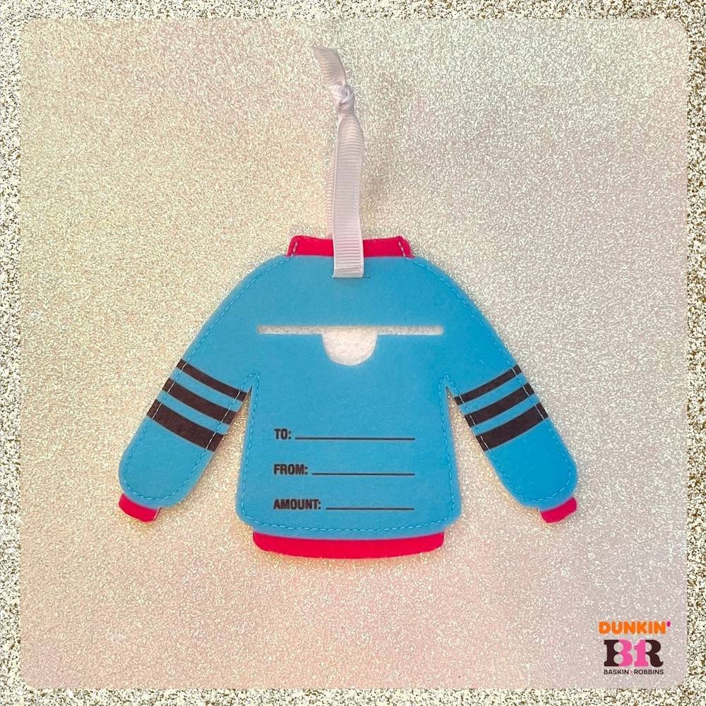 This listing is for a 2025 Baskin Robbins/Dunkin "Happy Holidays" Gift Card with the felt Christmas Sweater Ornament Sleeve. The card is brand new with the PIN still intact. It has no stored value at this time, but you can load money to the card at a Dunkin/BR store or on the app. Buy with confidence. If I didn't have to provide tracking, I wouldn't charge for shipping. Thank you for checking out my listing, I hope you have a great day π