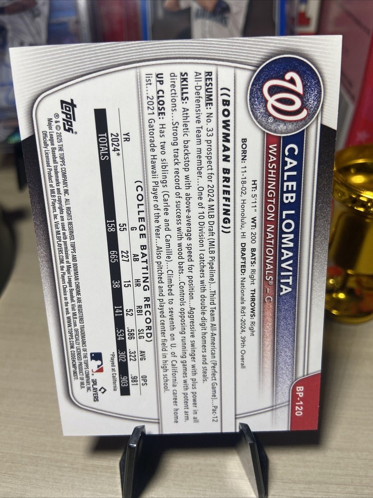 Just pulled this sweet Caleb Lomavita Pink Parallel—numbered 219/299! The vibrant pink border really pops, and the card’s in perfect condition. As a Nationals prospect, Lomavita’s got serious potential, making this a must-have for collectors. Love the exclusive Bowman feel—definitely a standout in my collection!