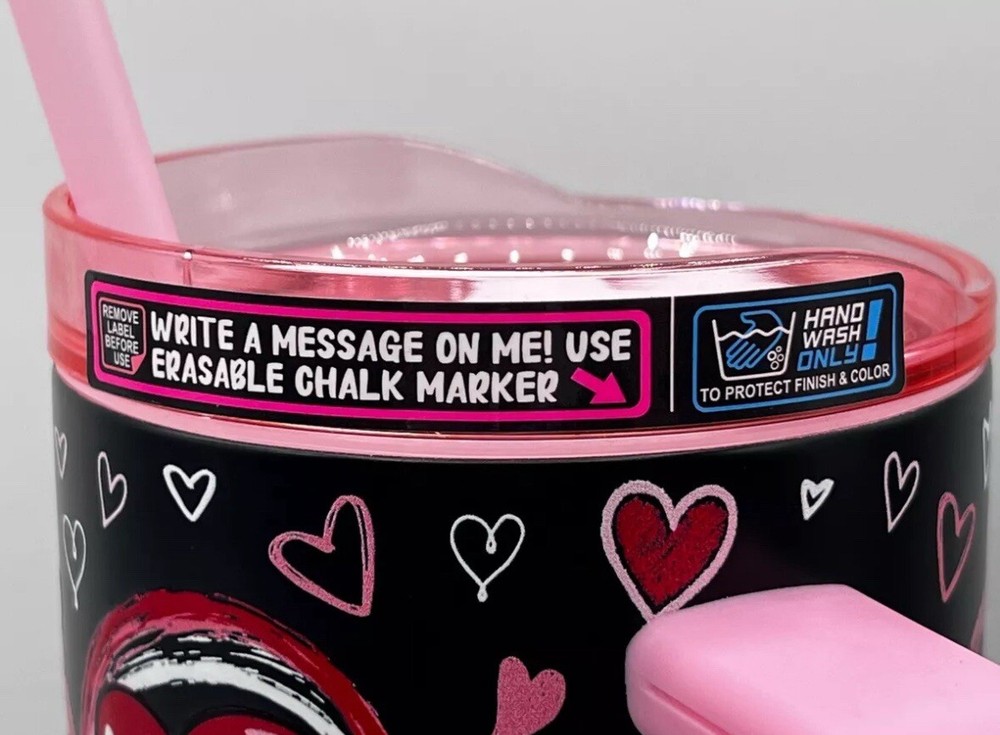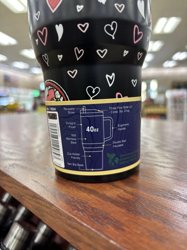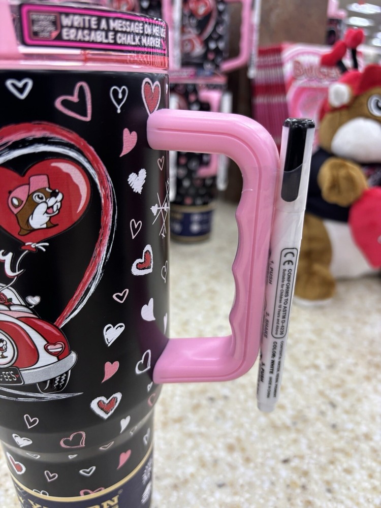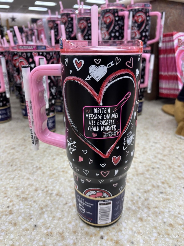 This Buc-ee’sYukon 40oz Tumbler is a stainless steel insulated cup that keeps beverages hot for 6 hours and cold for 24 hours. It features a slide lock lid with a reusable straw & a sweat-free exterior. Writable Surface: This tumbler is a unique writable surface and comes with an erasable chalk marker. Personalize your tumbler with a sweet Valentine’s message, doodle, or your name! Wipe it clean and write something new whenever you want.