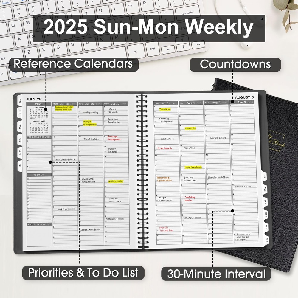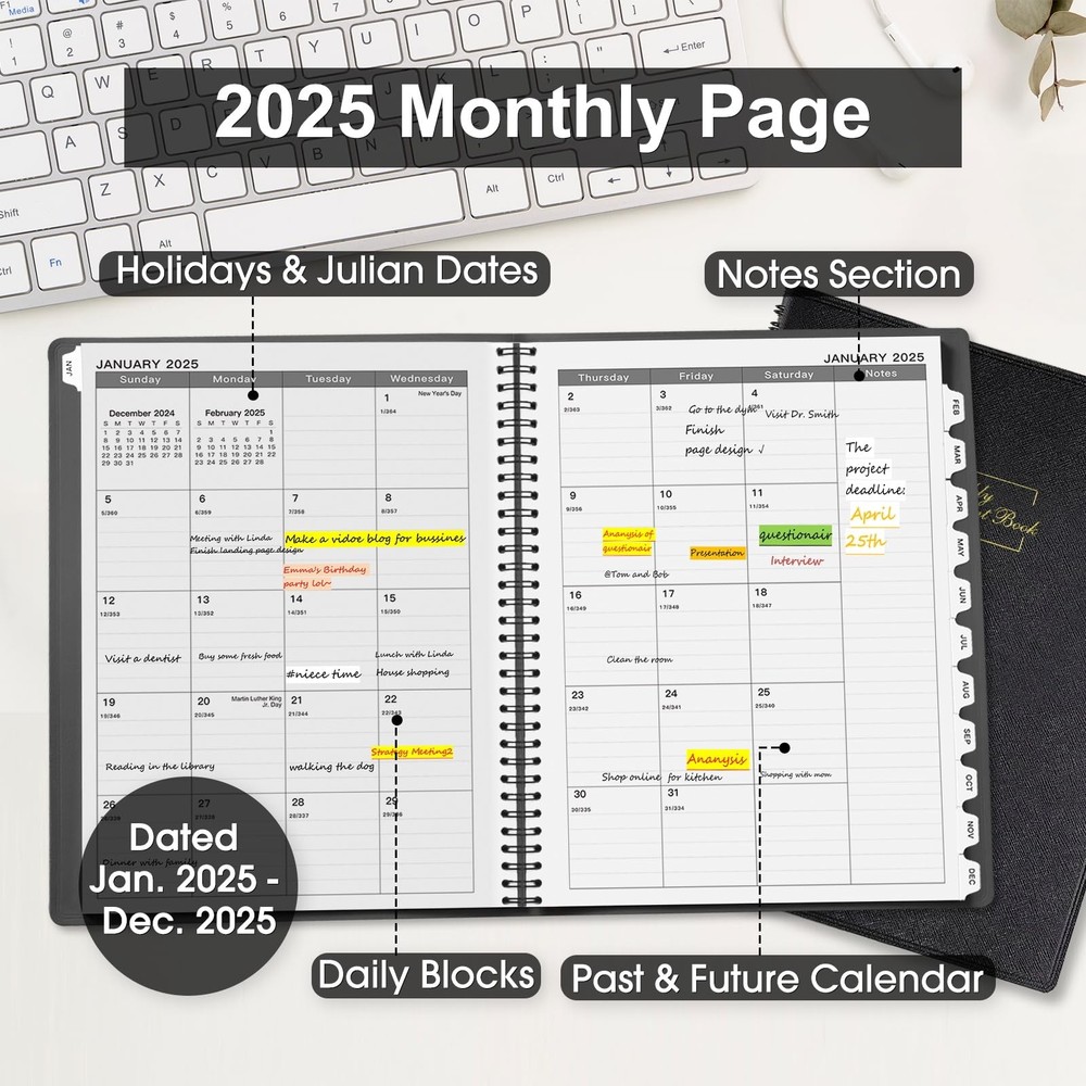 The 2025 Weekly Appointment Book is an 8.5" x 11" planner designed for optimal organization and productivity from January to December 2025. The 2025 planner features a soft cover and includes monthly, weekly, daily, and hourly planning with 15-minute increments, ideal for school, office, and work schedules. Keep Your Day On Track & Boost Your Productivity - Start planning ahead with this 2025 daily planner, featuring 12-month from January 2025 - December 2025, the comprehensive 2025 hourly, daily, weekly, monthly and yearly planner, allowing you to jot down detailed appointments, important things and other notes - all in one place, keeps yourself organized well for the whole year and increase productivity, perfect for school office work daily planning. Versatile Usage & Stay On Top Of Schedule- Sized at 8.5×11", each month displays across two full pages, offers ample space for academic daily affairs, work deadlines, and household task. This 2025 appointment book also features one week per two page spread. Schedule your day from 7:00 a.m. - 8:30 p.m. in 15-minute intervals from Monday to Sunday to set yourself up for purposeful days. Stay focused & manage your time efficiently! Elegant Design & Perfect For All Lifestyles- Enjoy a thicker planner appointment book with a soft leather cover and premium high-quality paper, a quick glance provides with a professional and structured approach to time management and personal growth. Ideal for college students, teachers, professionals and homemakers. A perfect school/work planner for setting your targets, managing daily assignments, cultivating healthy life habits and optimizing success. PERFECT ORGANIZATION - The 2025 hourly appointment planner measures 8.5×11", thicker than other 2025 daily appointment book on Amazon, with a soft faux leather cover. There are 1 page of future planning | 1 page of yearly overview for 2024-2026 | 1 page of major holidays of 2024-2026 | 1 page for quick reference information | 8 lined pages for some notes, ideas, meetings and appointments. Now Is The Best Time To Prepare Your 2025 - Open your fabulous 2025 with this daily planner! Our Appointment Book 2025 helps everyone keep on top of the long-term goals and detailed assignments in studies and works, making it an purposeful present that fosters organization and personal growth for birthdays, graduations, shcool open days and festive seasons throughout the year.