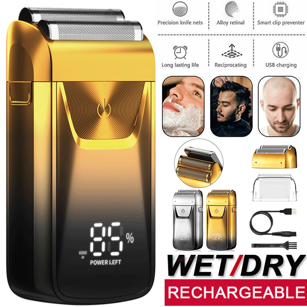 Description ★ Foil shaver: Easily and comfortably trims face, neck and chin. Safe and clean without hurting the skin. ★ Speed: The shaver has 3 speed adjustments. 6 500RPM at most. Give you a quick shave. ★ Pop-up trimmer: Easily and quickly trim longer beards and sideburns for you. Leaves your face refreshed and cleansed. ★ LED: The LED display clearly shows the remaining percentage of the battery. Reminds you to recharge your hair shaver. ★ Battery power: The shaver has a built-in 1 4 00mAh battery, which can be used for up to 1 2 0 minutes after charging for 2 hours. Product Details : Material: ABS Color: Gold /Sliver Power: 5 w Charging Time: 2 Hours Use Time: 120 Minutes Battery: Lithium Battery 14 00mAh Size: Approx. 12x6x3.8cm / 4.7*2.3*1.5inch What You Get : 1 * Men's Shaver 1 * Spare Shaving Head 1 * USB Charging Cable 1 * Clean Brush 1 * Protective C over 1 * Instruction manual