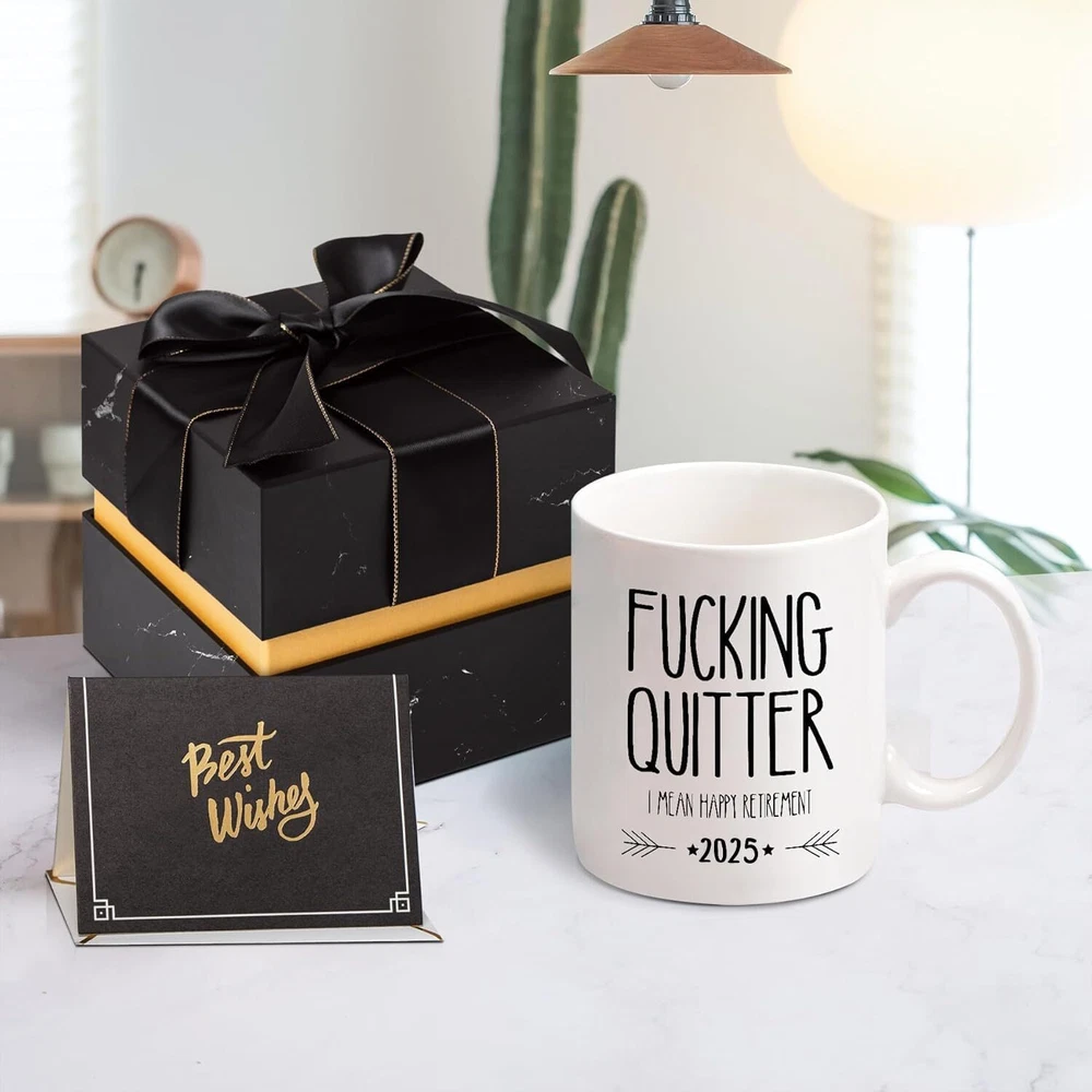 2025! 2025! 2025! 2024 FUNNY RETIREMENT GIFTS MUG: Superior quality retirement gifts for men and women, "Fucking Quitter I Mean Happy Retirement" sign coffee mug, Humorous retirement gifts are sure to be the talk of the retirement party. 2025 PRACTICAL RETIREMENT GIFT: Our coffee mugs are practical and funny retirement gifts, Custom Designed Retirement Coworker cup For Friends, Family and Coworkers.In the casual retirement life, Pick up a cup of coffee with the coffee cup you sent, enjoy the coffee. The owner will love this gift. FUNNY RETIREMENT GIFTS: This funny coffee mug is fired at high temperature and the ceramic is very resistant to high temperatures, the retirement mugs will not crack or crumble with hot or cold ice, the pattern on the coffee mug is printed with lead-free ink, Long Lasting, And Lead-free Design For Your Safety On Mar 31, 2025 at 20:58:47 PDT, seller added the following information: