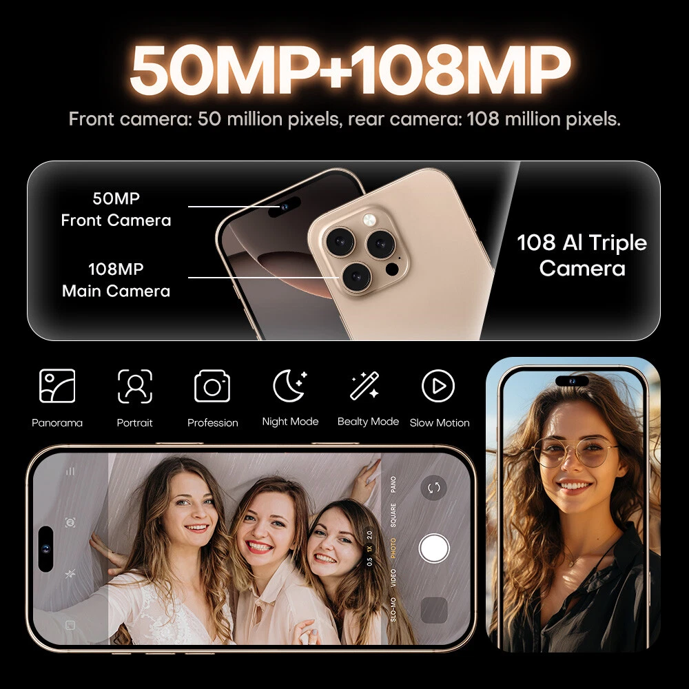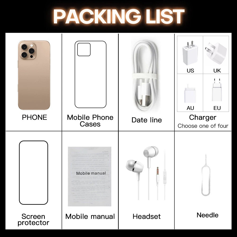 Factory Unlocked i16 Pro Max 7.3 inch 4G 5G Android Smartphone Dual SIM Cell Phones Factory direct sales, better quality but lower price is our target and mission! Note: There may be tariffs, and buyers should pay local customs duties 1:1 Size ,this phone can fit iphone 16 pro max cases! Features : - 7.3inch FHD Display The i16proMax delivers the viewing experience you always wanted, With a massive 93% screen-to-body ratio on a 7.3 "inch screen . - 50 MP Front Camera Clear and Stylish Selfie The i16proMax world-leading 50 MP front camera turns your every self i e into a work of art e xperience greater brightness, color vibrancy, clarity and dynamic range. E ven in the dimmest light, w henever you need it , your i16proMax is right there with you, capturing every moment with crystal-clear precision, Turn your selfies into masterpieces and shine in every photo . - 108MP Rear HD camera The i16proMax features a 108 MP camera combination. The main camera sports a large f/1.8 aperture and 1.28um pixels, This strong combination boosts photo-sensitivity in backlight or low light, Just point and shoot, and i16proMax will make sure your pictures remain clear and bright . - Face Access The i16proMax also supports facial recognition u pon activation, i16proMax scans your facial features and unlocks instantaneously a ccessing your phone has never been so easy, or so fun . - Powerful Performance The Snapdragon 8 gen2 mobile platform with 10mm process technology makes young people who love the young and other popular games. The game is on and lower . - Android 1 4 .0 The new interactive design makes the operation simple and simple, the use of the mobile phone is so simple and straightforward, everything is handy . - Dual SIM card supports TF card Dual card dual standby, card slot does not distinguish between the main and the deputy, supporting the worlds 50 major communication carrier networks - Camera Button Camera Control gives you an easier way to quickly access camera tools. A high-precision force sensor with haptic feedback emulates the feel of a DSLR camera shutter. Recognizes precise interactions like clicks and slides. Specification: 1.Model No.: i16proMax 2.Platform : Snapdragon 8 gen3 , Deca Core (Latest 10 Core) 3.Standby: Dual sim dual standby 4.Screen: 7.3 HD+ Full Display 1440*3200 5.Speaker: 1511 Box Speaker 6.Frequency: GSM850/900/1800/1900MHz, 3G:WCDMA850/ 1700/ 1900/2100MHz *4G: TDD(B38\B40\B41 ), FDD (B1\2\3\4\5\7\8\20\28A\28B) * 5G 7.Vibration: Support 8.Colors: Desert Titanium ,Black Titanium,White Titanium,Natural Titanium 9.Memory: 16 GB RAM+ 1T B ROM 10.Multi Media: MP3/MP4/3GP/FM Radio/Bluetooth 11.Camera: 50 MP+ 108 MP 12.Multi Function: Full screen, Face recognition, Dual SIM, 2.4&5G Wi-Fi , GPS, Gravity Sensor, Alarm ,Calendar ,Calculator ,Audio recorder ,Video recorder, WAP/MMS/GPR S , Image viewer,E-Book,World clock,Tasks card , rear flash 13.Languages: Muti-language support 14.Others: Android OS 1 4 .0 System 15.Battery: 80 00 mA h Lithium-ion battery 16.Ultra unibody 17.TypeC input Package Included: 1 x Smartphone, 1 x Charger Adapter, 1 x Headphones, 1 x User Manual , 1 x phone case , 1 x Protection film Attention: *In terms of memory and capacity, the actual available capacity will be reduced and different due to many factors: because the operating system occupies part of the memory (RAM), the actual available space is less than the marked memory capacity; due to the installation of the operating system and pre-installed programs occupy part of the flash memory (ROM), and the actual available storage space is less than the indicated flash memory capacity. *The mobile phone support GSM,WCDMA (For example USA operators : T-mobile , AT&T , Straight Talk , Cricket Wireless , Google Project Fi , Lycamobile , MetroPCS , MintMobile), whether to support 4G, 5G depends on the local operator networksupport,does not support the Telecom CDMA network. (For example USA operators : Verizon , Sprint , U.S Cellular , Boost Mobile , FreedomPop , Ting ) , *In terms of charging, data such as speed and duration are all our laboratory data, and the actual situation may vary slightly depending on the version of the test software and the specific test environment. In the end, the actual usage time shall prevail. *When the phone is completely out of power and automatically shuts down, you need to charge your phone for more than 10 minutes to boot. It is recommended to charge when the battery is less than 20% charged. *The screen pictures and product description display pictures provided on this website are all schematic diagrams for reference, and the actual situation shall prevail in kind. *Product pictures, models, data, functions, performance, specifications, user interface and other product information are for reference only. We may improve the above content. For specific information, please refer to the actual product and product manual. remove Unless otherwise specified, the data involved in this website are the results of our internal tests, and the comparisons involved are all compared with our products. *The general mobile phones compared on the page are our own mobile phones. Unless otherwise specified, the product site provid