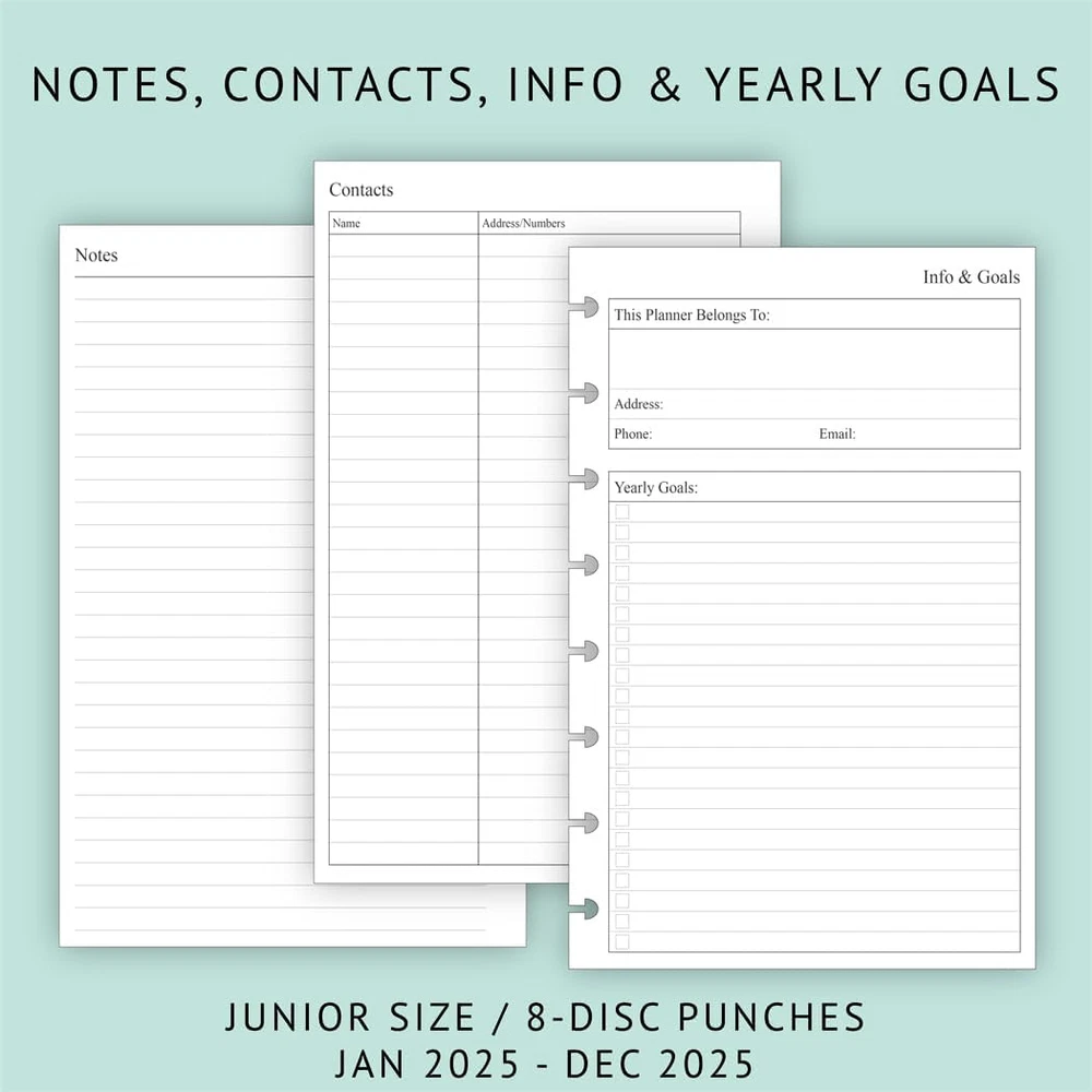 Fast Shipping Great Customer Support Satisfaction Guaranteed DESCRIPTION Shipping Shipping Shipping All domestic packages are shipped for Free (Unless other shipping method was selected during the checkout) Most items ship and arrive much sooner than the estimate delivery date. Usually within 2-3 days from payment. However, we have longer estimates to compensate for the occasional delay or supply chain breakdown. We do not accept P.O. BOXES - PLEASE PROVIDE A PHYSICAL ADDRESS Return Return Return In the event that you would like to return your purchase, we allow returns that are processed within the defined return date (the return date is to be found in the return policy/shipping and handling section) Please contact us for a return authorization and the return shipping address. Payment Payment Payment PayPal is our preferred method of payments it's the quickest, easiest and most secure way to pay for your goods or services online. PayPal offers buyer and seller protection should there be a problem. If you do not have a PayPal account, to get started and buy your first item with us is very easy. Simply click on the 'Buy It Now' button and follow the eBay checkout steps. Select PayPal as the payment method you then will be given the chance to enter your card details in to PayPal's secure checkout in order to pay for your order. Once the payment has been made, you will then be given the opportunity to make your own PayPal account to make paying for your items in the future very easy. Should there be a problem with payment please do let us know. Feedback Feedback Feedback Customer satisfaction is very important to us. If you have any problem with your order,please contact us and we will do our best to make you satisfied, please do not leave a negative feedback before we resolve your problem. We guarantee that your issue will be solved quickly. As long as you are happy with your purchase of , please leave us a positive feedback. Your feedback is very important to us it affects our search placement on eBay. We will leave a positive feedback for you in return automatically once we receive your feedback. Contact Us Contact Us Contact Us If you have any queries, please contact us via ebay. We usually respond within 24 hours on weekdays. Thank you for visiting our ebay store! 8-disc punched planner refills compatible with Arc, Levenger, TUL junior size discbound planners 2025 year weekly pages run from January 2025 to December 2025 Weekly spread includes Week's Focus & 2-month calendar sections on the top and a Monday to Sunday format 2 page monthly spread with ruled daily blocks, calendar & notes section, laminated tabs to allow quick turning Additional pages: calendar & holidays, contacts, yearly goals and important dates pages, 3 monthly spread pages for early planning (Oct 2024 to Dec 2024, no weekly pages) 2025 Junior Size Weekly & Monthly Planner Refill, 8-Discbound, 2 Pages/Week Click here to see description Fast Shipping Great Customer Support Satisfaction Guaranteed DESCRIPTION Shipping All domestic packages are shipped for Free (Unless other shipping method was selected during the checkout) We ship within two business days of payment, usually sooner Standard FREE shipping takes between 3-5 business days Expedited shipping takes between 2-3 business days Overnight shipping takes between 1-2 business days We do not accept P.O. BOXES - PLEASE PROVIDE A PHYSICAL ADDRESS We Ship Globally using ebay's GSP, the item is sent to a logistic center in KY and shipped from there to the rest of the world. International customers are responsible for all duties and taxes Contact your local authority for questions related to the amount of duties or taxes you will be responsible for Return In the event that you would like to return your purchase, we allow returns that are processed within the defined return date (the return date is to be found in the return policy/shipping and handling section) Please contact us for a return authorization and the return shipping address. Please contact us for a Return Merchandise Authorization (RMA) number. We advise you to use a reputable carrier service when returning your goods. Please pack all returns appropriately. We ship globally Via eBay's global shipping program (GSP). Thus we don't cover returns for items shipped globally. Buyers returning such items will be refunded ONLY for the item's cost and not for the shipping. please check the Voltage information and make sure it matches the one in your country. In case it's not stated in the description, do ask us. Payment PayPal is our preferred method of payments it's the quickest, easiest and most secure way to pay for your goods or services online. PayPal offers buyer and seller protection should there be a problem. If you do not have a PayPal account, to get started and buy your first item with us is very easy. Simply click on the 'Buy It Now' button and follow the eBay checkout steps. Select PayPal as the payment method you then will be given the chance to enter your card details in to PayPal's secure checkout in order to pay for your order. Once the payment has been made, you will then be given the opportunity to make your own PayPal account to make paying for your items in the future very easy. Should there be a problem with payment please do let us know. Feedback Customer satisfaction is very important to us. If you have any problem with your order,please contact us and we will do our best to make you satisfied, please do not leave a negative feedback before we resolve your problem. We guarantee that your issue will be solved quickly. As long as you are happy with your purchase of , please leave us a positive feedback. Your feedback is very important to us it affects our search placement on eBay. We will leave a positive feedback for you in return automatically once we receive your feedback. Contact Us If you have any queries, please contact us via ebay. We usually respond within 24 hours on weekdays. Thank you 
