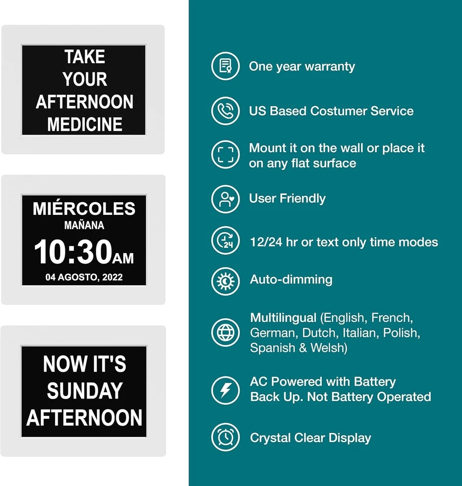 2025 Large Digital Dementia Clock for Seniors with Custom Alarms & Date Display ‹ › ‹ › ‹ › ‹ › ‹ › ‹ › ‹ › ‹ › ‹ › 2025 Large Digital Dementia Clock for Seniors Experience the ease and independence that comes with our thoughtfully designed Large Digital Dementia Clock. Perfectly tailored for seniors, this clock becomes more than just a timekeeper; it’s a vital companion for daily living. Features: Durable Material: Built to withstand the rigors of daily life, our clock is designed to be reliable and long-lasting, ensuring it remains a steadfast aid for those with dementia or Alzheimer's. Easy-to-Read Display: Featuring a large, high-contrast display that ensures clear visibility in all lighting conditions, making it easy for elderly individuals to discern the time and date. Simple Setup: Comes with a user-friendly manual, this clock is easy to set up and operate, meaning you can have it running effortlessly in moments. Customizable Alarms: Offers multiple alarm options, enabling you to set reminders and up to 5 daily alarms for essential tasks like taking medication or attending appointments. Auto-Dimming Feature: Automatically adjusts its brightness to complement the room’s ambient light, ensuring that visibility is never compromised. Multi-Language Support: Designed for accessibility with multiple language options and different time formats, catering to a diverse range of users. Backup Functionality: Equipped with a backup feature to maintain accurate time and date during power outages, resetting automatically when power is restored. Compact Size: Showcases a unique 8-inch high-resolution display with large, clear letters that eliminate confusion, presenting the time, period of the day, and date in a simple format. Why Choose Our Digital Dementia Clock? This versatile clock is an ideal gift for elderly loved ones, its packaging intentionally omits terms associated with dementia and memory loss, making it a considerate and practical choice. Our commitment doesn’t end with the purchase; we offer free returns within the first 30 days and a full 1- . Our dedicated customer service team is on hand to assist with any inquiries or concerns. Empower your loved ones to stay organized and independent. Order your Large Digital Dementia Clock today! Shipping Free & Fast Shipping - We offer free shipping to most of the USA with a normal delivery time of 3-7 days. However, due to the current situation, additional delivery time (up to 3 weeks) may be required for some items. Alternative Carriers - We may use alternative carriers (e.g. USPS, FedEx, UPS, etc.) to ensure your package arrives safely and on time. Due to the use of multiple carriers, we are unable to provide a tracking number automatically. Handling Time - Orders are processed and shipped within 1-2 business days of receiving cleared payment. Shipping Restrictions - Shipping to Alaska, Hawaii, Puerto Rico, Guam, and other US territories may incur shipping charges or delivery restrictions. Please contact us before ordering, or your order can be refunded/cancelled. State Restrictions - There may be restrictions based on your state of purchase. For example, certain items may not be shipped to California due to state regulations. Contact for Tracking Updates - If you require tracking updates or have any concerns about the delivery of your order, please feel free to contact us, and we will be happy to assist you. Return 30-Day Hassle-Free Returns - We want you to be completely satisfied with your purchase. If you are not, you can return the item within 30 days of receiving it for a full refund or exchange. Easy Return Process - To start a return, simply contact us and we will provide you with a prepaid return shipping label and detailed instructions. Restocking Fee - There are no restocking fees for returns. However, the buyer is responsible for return shipping costs if the return is not due to a seller's error. Refund Processing Time - Refunds will be processed within 5 business days of receiving the returned item in its condition. Payment We accept all major credit cards, PayPal, and Apple Pay for your convenience. Your payment information is secure and encrypted to ensure a safe and seamless transaction. Please complete your payment within 3 days of purchase to avoid any delays in shipping. Feedback Your feedback is extremely important to us. We strive to provide the best products and customer service possible. If you are satisfied with your purchase, please take a moment to leave us a positive review. If you have any concerns or issues with your order, please contact us before leaving negative feedback. We are committed to resolving any problems and ensuring your satisfaction. Contact Us If you have any questions or concerns, please feel free to out to our customer support team. You can contact us through the eBay messaging system. We are available Monday to Friday, 9:00 am to 5:00 pm EST, and we will do our best to respond to your inquiry within 24 hours. Buy it now and enjoy a pleasant shopping experience! Item Length: Dementia Clock for Seniors Product Line: Dementia Clock for Seniors Unit Quantity: 0.8 pounds Features: Large Display,Customizable alarms,Multiple Alarm Options,Easy to read display,Simple setup,Auto-dimming feature,Multi-language support,Backup,Tabletop Mounting Theme: Number Material: Plastic Room: Bedroom,Dining Room,Living Room,Home Office Department: Kids,Teens,Adults Type: Digital Clock Display Type: Digital Color: White Movement: Automatic Power Source: Corded Electric Style: Contemporary Frame Material: Plastic Manufactured: 2025 Shape: Rectangular Protection Plan: No Coverage Item Weight: 0.8 pounds Unit Type: lb