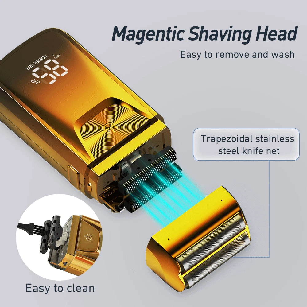 Description ★ Foil shaver: Easily and comfortably trims face, neck and chin. Safe and clean without hurting the skin. ★ Speed: The shaver has 3 speed adjustments. 6 500RPM at most. Give you a quick shave. ★ Pop-up trimmer: Easily and quickly trim longer beards and sideburns for you. Leaves your face refreshed and cleansed. ★ LED: The LED display clearly shows the remaining percentage of the battery. Reminds you to recharge your hair shaver. ★ Battery power: The shaver has a built-in 1 4 00mAh battery, which can be used for up to 1 2 0 minutes after charging for 2 hours. Product Details : Material: ABS Color: Gold /Sliver Power: 5 w Charging Time: 2 Hours Use Time: 120 Minutes Battery: Lithium Battery 14 00mAh Size: Approx. 12x6x3.8cm / 4.7*2.3*1.5inch What You Get : 1 * Men's Shaver 1 * Spare Shaving Head 1 * USB Charging Cable 1 * Clean Brush 1 * Protective C over 1 * Instruction manual