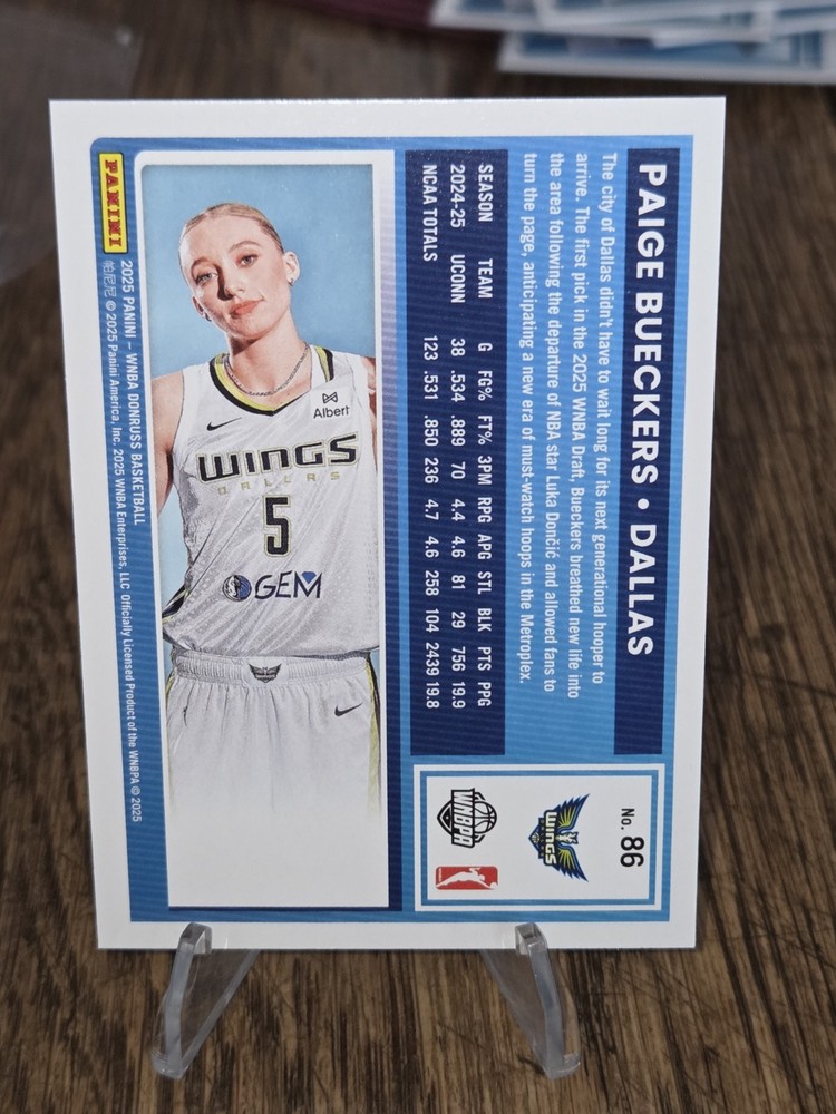 The product is a 2025 Panini Donruss WNBA Paige Bueckers Rated Rookie trading card featuring the player Jakobi Meyers from the Dallas Wings. The card is a standard size made of 20 Pt. card stock and is an original, not a reprint. It is in English and is part of the Women's National Basketball Association (WNBA) league. The card is unautographed and is in near mint or better condition. This collectible piece is a must-have for fans and collectors of basketball trading cards.