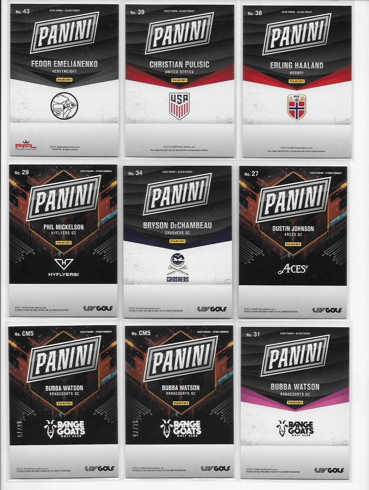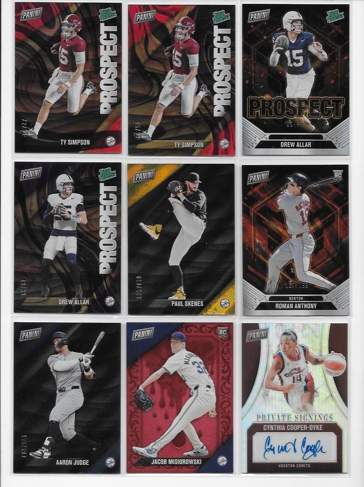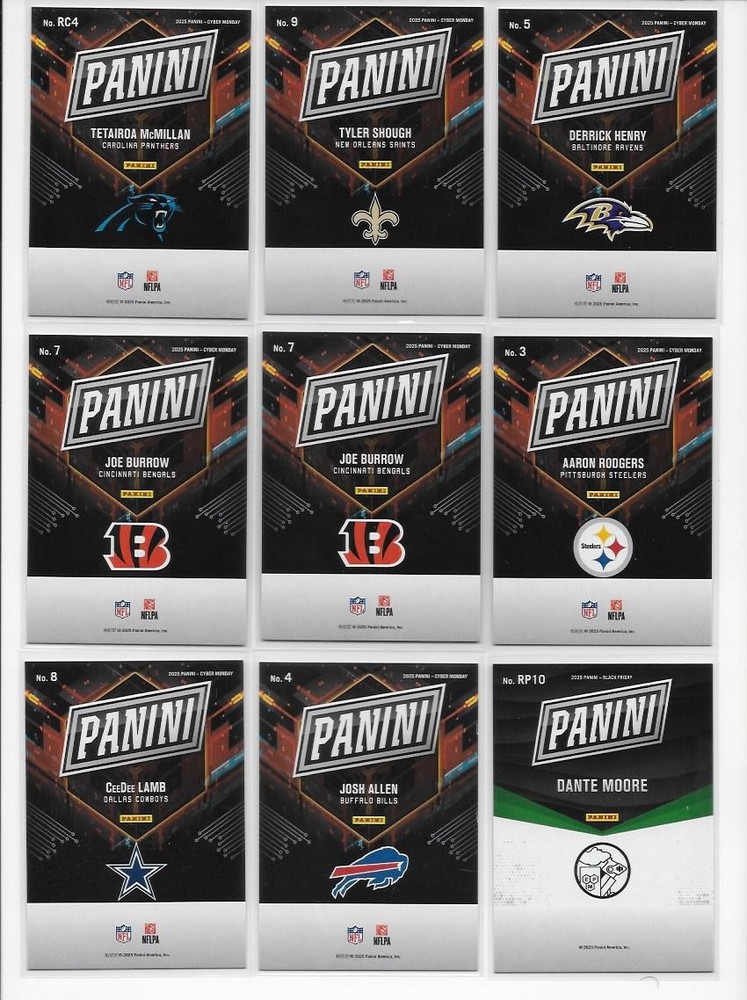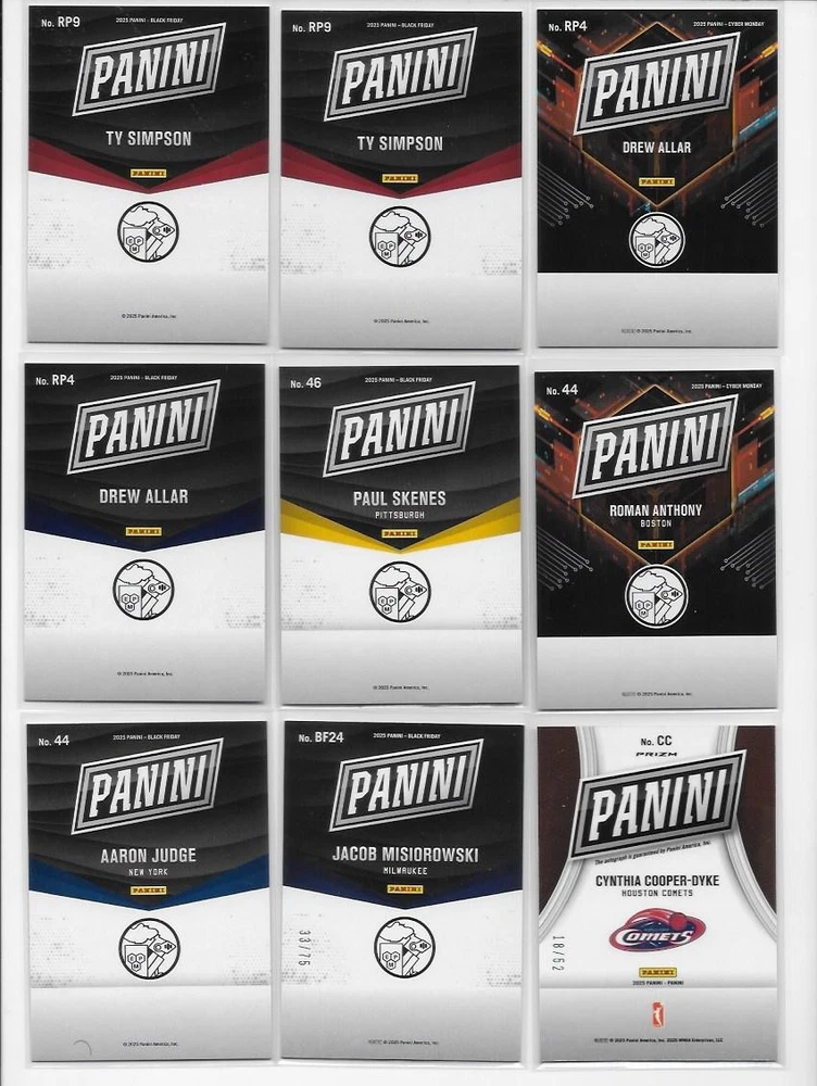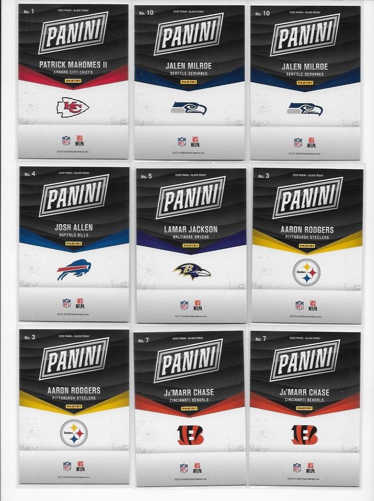 2025 Panini Black Friday Cyber Monday Black Friday 53 Card Lot Mahomes Skenes 53 cards are included. Every card shown is included with this lot, great upside potential! Any scratches or scuffs are either from the scanner or the case, and NOT on the card unless noted. I do combine shipping! Simply place all items you would like into your cart, and then click request total. I'll then combine the shipping to save you money! All cards ship properly protected in a bubble mailer or box. I ship within 1 business of of cleared payment.