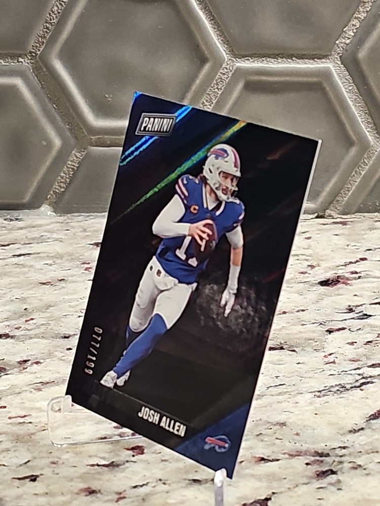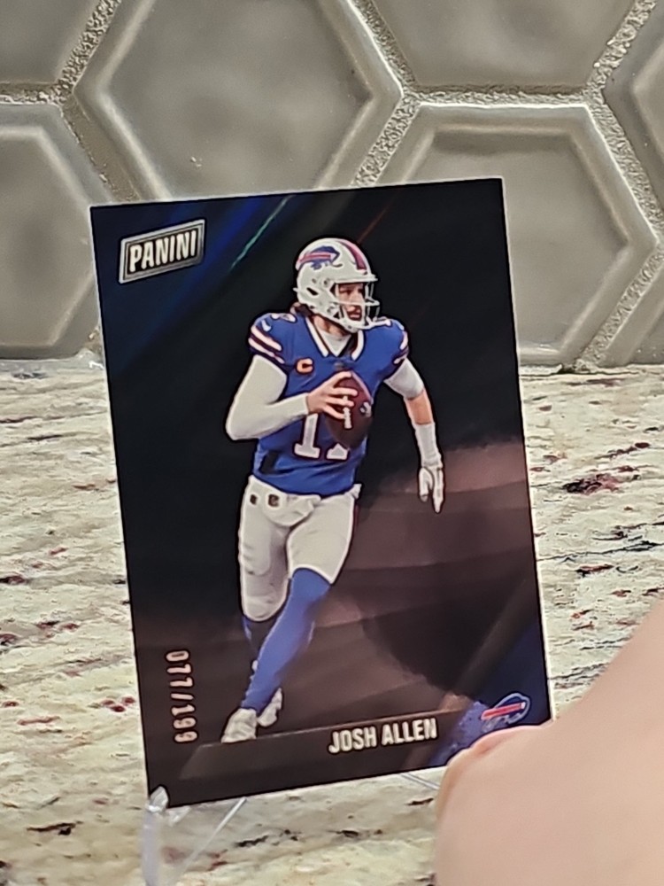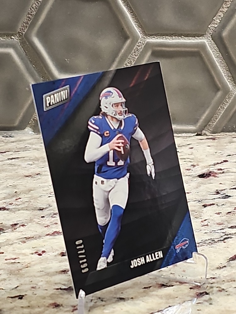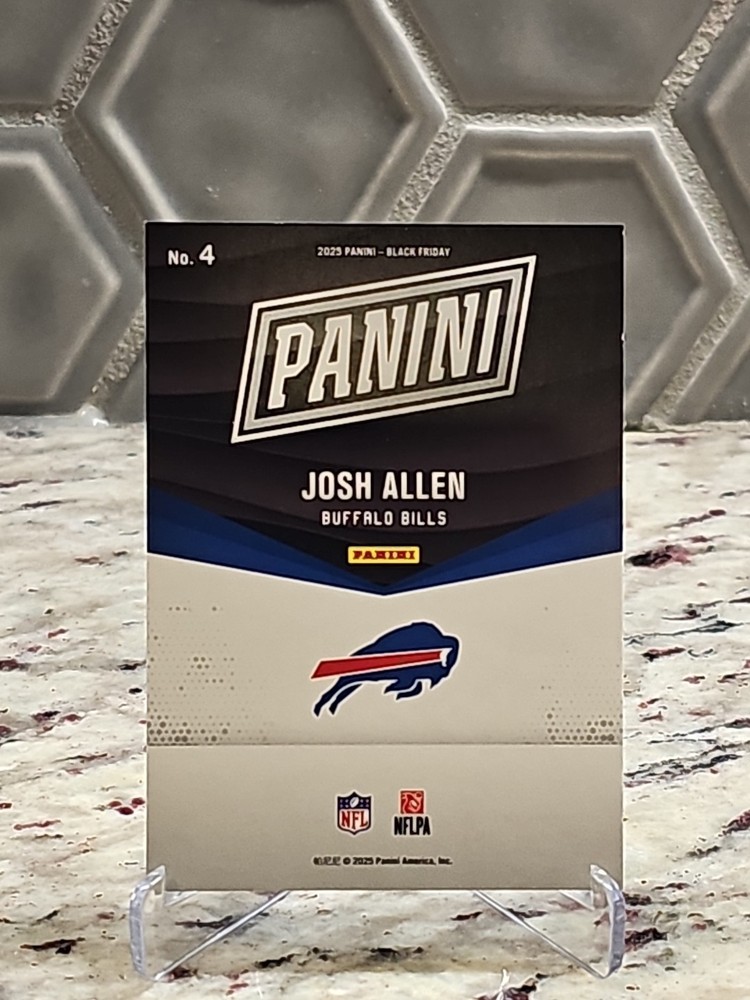 The product is a 2025 Panini Black Friday Exclusive Josh Allen trading card featuring a serial number out of 199. This football trading card includes the Buffalo Bills player Josh Allen, part of the National Football League (NFL). Manufactured by Panini, this limited edition card is a special parallel variety in black, making it a highly sought-after collectible for fans and collectors alike.