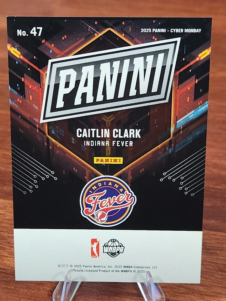 The product is a 2025 Panini Cyber Monday trading card featuring basketball player Caitlin Clark. This rare card is numbered out of 199, making it a highly sought-after collectible for fans and collectors alike. The card is from the 2025 Panini set, manufactured by Panini, known for producing high-quality sports trading cards. This limited edition card captures a moment in basketball history and is a valuable addition to any sports memorabilia collection. *Item ships within 48 hours of processing* **Ships in bubble mailer, and top loader and card envelope** ***FB1***