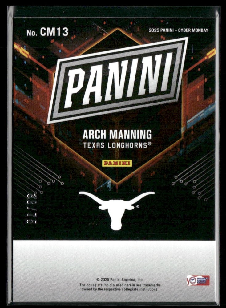 The product is a 2025 Panini Cyber Monday Arch Manning Red #12/75 Longhorns sports trading card. This collectible item features the player Arch Manning from the football team Longhorns, with a limited edition red parallel variety. Manufactured by Panini, this card is part of the 2025 Panini set, making it a sought-after item for sports trading card enthusiasts and fans of the player.