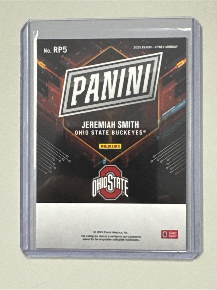 The 2025 Panini Cyber Monday Jeremiah Smith /99 trading card is a rare and collectible item perfect for football fans and trading card enthusiasts. Produced by Panini, known for their high-quality sports trading cards, this limited edition card features Jeremy Smith from the 2025 football season. With only 99 copies available, it is a sought-after item that will surely be a prized possession for any collector.