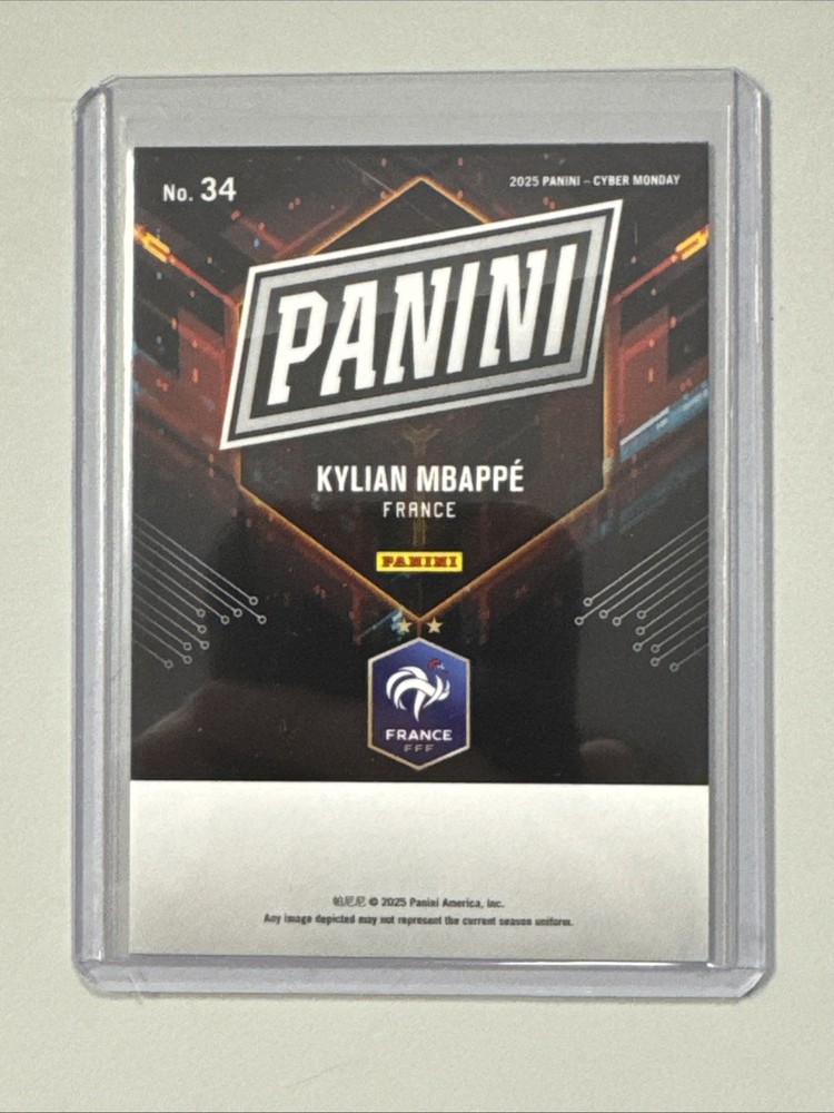 The 2025 Panini Cyber Monday Kylian Mbappe trading card is a highly sought-after collectible for soccer fans. Limited to just 199 copies, this card features Kylian Mbappé, a talented player from the 2025 season. Produced by Panini, known for their quality sports trading cards, this rare item is a must-have for fans of the sport looking to add a unique piece to their collection. The Cyber Monday promotion adds an extra layer of excitement to this special release, making it a valuable and coveted item for collectors.