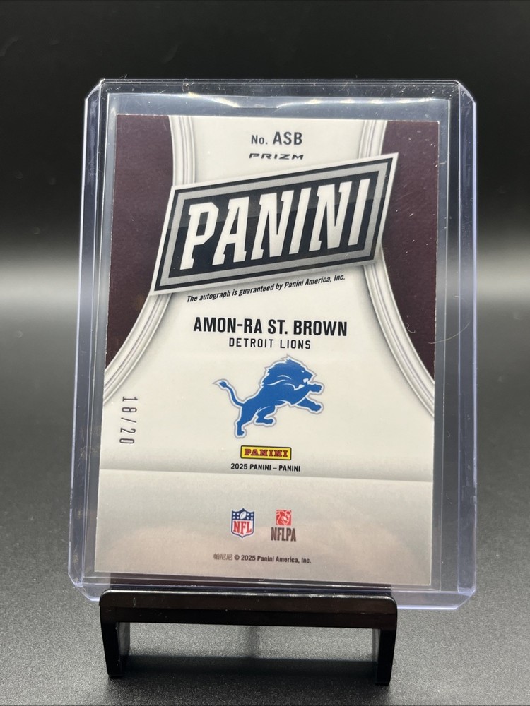 The 2025 Panini Cyber Monday Private Signings Amon-Ra St Brown Auto trading card is a highly sought-after collectible featuring the autograph of Amon-Ra St. Brown, a talented player from the Detroit Lions in the NFL. This rare card is numbered out of 20, making it a special edition for football fans and collectors alike. With its unique design and limited availability, this card is a valuable addition to any sports trading card collection.