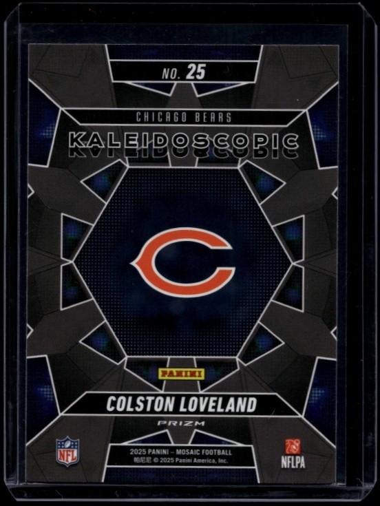 The 2025 Panini Mosaic Football Colston Loveland #25 RC Rookie Kaleidoscopic trading card is a must-have for NFL fans and collectors. This rookie card features a stunning kaleidoscopic design, making it a unique and valuable addition to any collection. Don't miss your chance to own this rare and highly sought-after card!