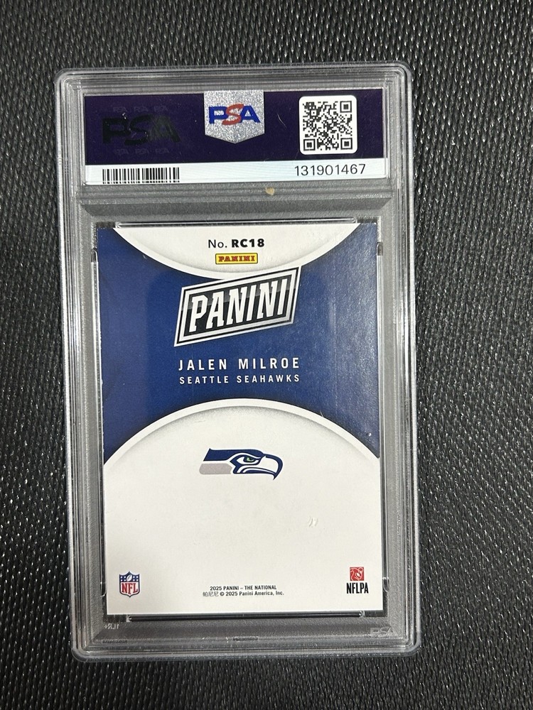 🎽JERSEY MATCH 06/25 PSA MINT 9🎽 The 2025 Panini NSCC Jalen Milroe Lightning /25 Jersey Match Seahawks PSA Mint 9 trading card is a highly sought-after collectible item for football fans. This card features the rookie player Jalen Milroe from the Seattle Seahawks and Alabama Crimson Tide, with a limited print run of only 25. Manufactured by Panini as part of the 2025 set, this card is a special edition parallel variety from the Nscc Silver Pack, making it a valuable addition to any sports trading card collection.