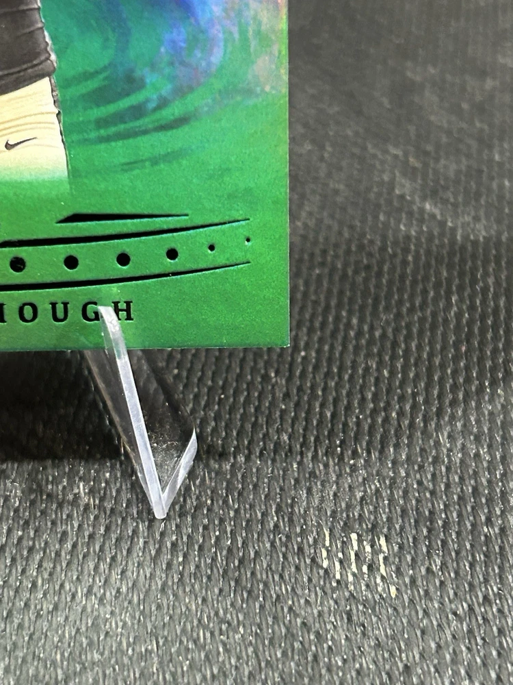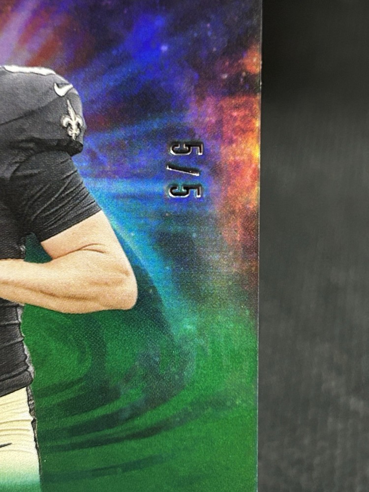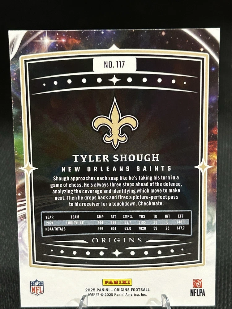 The product is a 2025 Panini Origins Tyler Shough Green Rookie Card numbered 5, featuring the player from the New Orleans Saints. This sports trading card is an original release by Panini and belongs to the National Football League (NFL) set. With a limited print run of 5, this card is highly sought after by collectors due to its rarity and association with a promising rookie athlete in the football world. It is a valuable addition to any sports memorabilia collection, especially for fans of the New Orleans Saints or Tyler Shough.