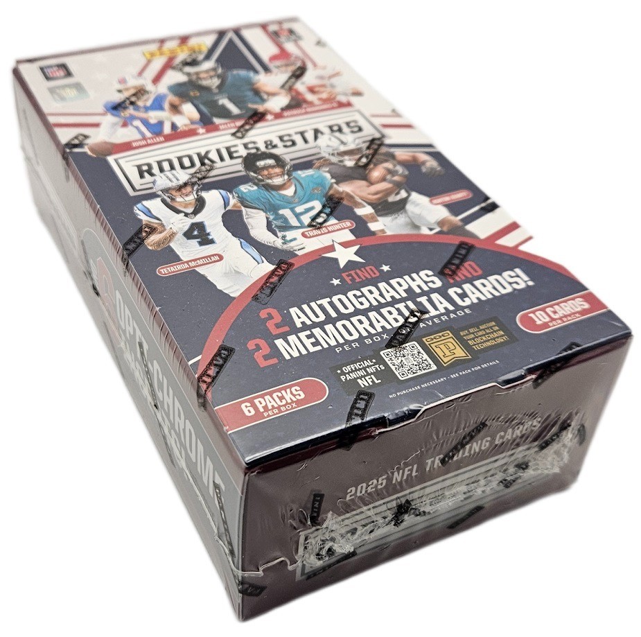 2025 Panini Rookies & Stars Football - Sealed Hobby Box 6 Packs Per Box - 10 Cards Per Pack 2 Autographs and 2 Memorabilia Cards Per Box Rookies & Stars Football returns for the 2025 season, packing calling-card inserts, such as Crusade, Thrillers, Stellar Rookies, Autograph parallels and more! From current stars to newcomers with the high potential, 2025 Rookies & Stars Football packs a powerful punch with incredible autograph-memorabilia combinations and chase-worthy inserts! Look for Hobby-exclusive Purple parallels! 2 Autographs 2 Memorabilia Cards 5 #’D Base Or Rookie Cards 12 Inserts Or Insert Parallels 12 Rookie Cards 6 Optichrome Inserts Or Insert Parallels From current stars to newcomers with the high potential, 2025 Rookies & Stars Football packs a powerful punch with incredible autograph-memorabilia combinations and chase-worthy inserts. 2025 Rookies & Stars features stunning inserts like Rookie Exclusive, Touchdown Club and Draft Class! Rookies & Stars Football returns for the 2025 season, packing calling-card inserts, such as Airborne, Thrillers, Artistry in Motion, Autograph parallels and more!