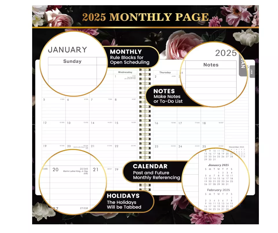 2025 Floral Planner – Your Perfect Planning Companion! Stay organized and stylish in 2025 with this beautifully designed floral planner, perfect for all your scheduling and planning needs. From January 2025 to December 2025, this planner offers ample space and functional features to help you stay on top of your tasks throughout the year. 2025 Planner Overview This planner covers 12 months, from January to December 2025, and comes in a practical 8" x 10" size. Its spacious design provides plenty of room for daily planning and scheduling, ensuring you have all the space you need to manage your busy life. Monthly Pages The monthly planning pages include a 12-month calendar overview, with lined daily blocks for easy note-taking. You'll also find holiday reminders, a lined note section, and three reference calendars (past, present, and future) at the page corners. These features help you better organize and plan your month with ease. Weekly Pages The weekly pages clearly list dates from Monday to Sunday on two pages, with a lined section for each day where you can jot down your plans. A small checkbox next to each task helps you track progress and stay organized. Additionally, each week features a three-month reference calendar at the top for quick planning. Functional and Durable Design This planner is designed with functionality and durability in mind. It includes: Stamped hardcover with a gorgeous bronzed pattern Premium thick paper to prevent ink-bleeding and feathering Strong twin-wire binding for easy handling and long-lasting use Yearly overview for a quick glance at the entire year Monthly tabs for easy navigation Quick reference information and contact pages for added convenience Holidays marked to keep you on track throughout the year Perfect Gift or Personal Use With its beautiful bronzing pattern and high-quality paper, this planner not only helps you stay organized but also adds elegance to your daily routine. It makes a thoughtful gift for friends, family, or loved ones, or a perfect personal planner to make your 2025 year truly special. Get Ready to Plan in Style The 2025 Floral Planner is more than just a calendar—it's a tool for staying organized and productive while adding a touch of beauty to your life. Don't wait—grab yours today and start planning for a successful 2025!
