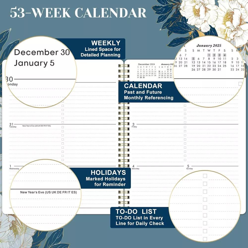 2025 Planner - JAN 2025 - DEC 2025, Weekly Monthly white, gold Product Details Manufacturer: Tersus Brand: Tersus Item Weight: 11.7 ounces Package Dimensions: 9.76 x 7.76 x 0.43 inches Color: white, gold Cover Material: Cardboard Material Type: Cardboard Ruling: horizontal Sheet Size: 8x10 inches Manufacturer Part Number: TS810LHJBHDZYXQ25 Brand: Tersus Color: white, gold Cover Material: Cardboard Year: 2025 Format: Notebook, Organizer Calendar Type: Gregorian Target Audience: Adult Sheet Size: 8x10 inches Material: Cardboard Item Weight: 0.33 Kilograms ⭐ JAN 2025 - DEC 2025 - This 2025 planner is from January 2025 to December 2025, including 12 months of monthly and weekly pages, helpful for daily planning. The size of the calendarplanner 2025 with floral pattern cover measures at 8" x 10", which is suitable to carry to office or school. ⭐ Clear Monthly Plan - Each monthly page of this planner 2025 has an overview of the month and ruled daily blocks for your monthly planning. The page contains holiday reminders, reference calendars and notes section. It can improve the likelihood of accomplishing your goals. ⭐ Detailed Weekly Plan - Each weekly page of this 2025 weekly and monthly planner includes enough writing space to prioritize work. When complete a task, you can put a tick in the checkbox to enhance your strong sense of accomplishment. ⭐ Perfect Design - The elegant design of this weekly and monthly planner 2025 is constructed with blue background and white flowers, which makes it more classic and fashionable. Strong twin-wire binding and round corner design keep it convenient to use. ⭐ Featured - 8" x 10" Monthly and Weekly Pages | Quick Reference Information | 2025-2026 Yearly Overview | 2025-2027 Holidays | Contact Pages | High Quality Paper | Twin-wire Binding |.