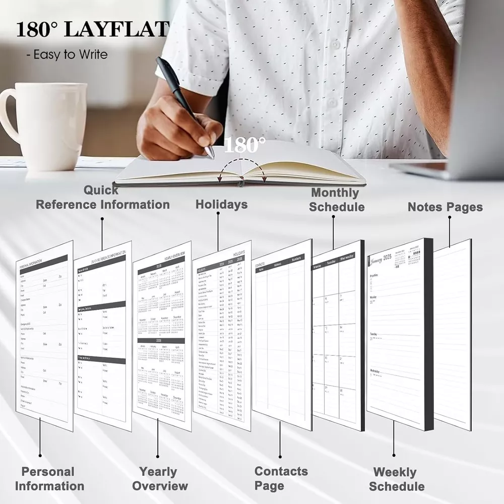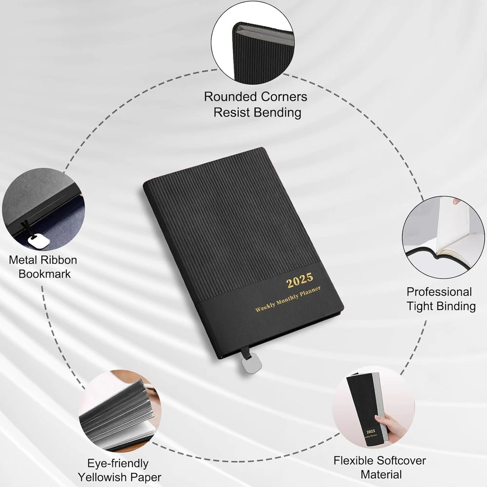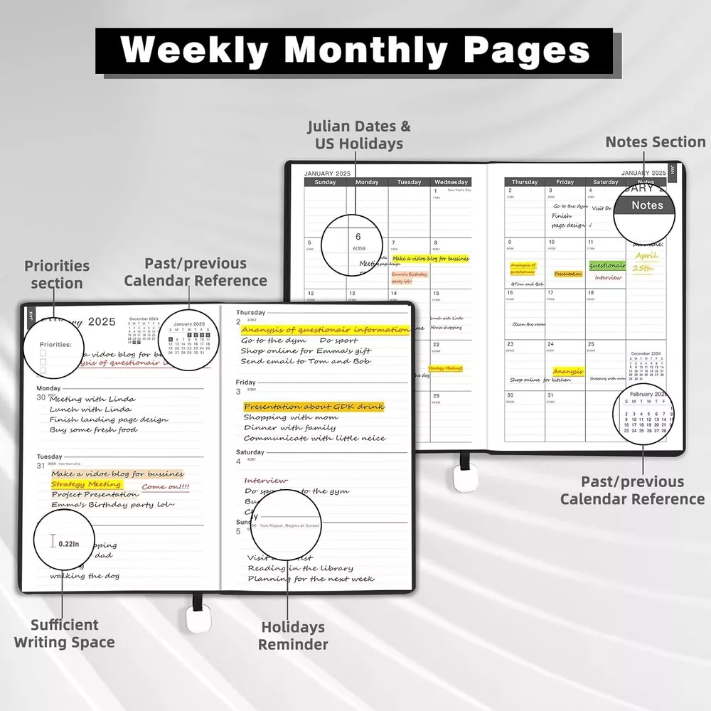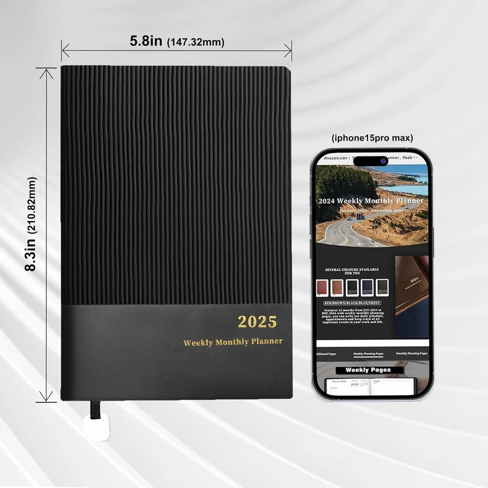 About this item: 【 YMUMUDA 2025 PLANNER 】This planner 2025 hardcover (8.25"×5.85") features 12 months from JAN. 2025 to DEC. 2025 with weekly monthly planning pages, the planner offers other additional pages to help you well organized for the academic year and increase productivity. 【 MONTHLY PLANNING 】Each monthly pages with lined daily blocks lists major US holidays and Julian dates, the calendar planner 2025 also contains a notes section and past/previous calendar reference for your better past reviewing and future planning. 【WEEKLY PLANNING】Weekly view pages contain enough ruled space for your detailed daily planning, appointments, activities and so on. Major Holidays Listed, elapsed and remaining days noted. Priorities section is designed to focus your energy on your most important goals. 【PROFESSIONAL DESIGN 】Planner Special Soft Cover | Safty Round Corner Design | Professional Tight Binding Metal | Ribbon Bookmark | Yearly Overview | Contacts | Quick Reference Information | Monthly Printed Tabs | Holidays | Weekly and Monthly Pages . 5 colors(Black/ Blue/ Brown/ Red/ Green) available for you to choose. 【WORRY-FREE GUARANTEE】Focus on providing planner with excellent production and professional design. We provide 30-day quality assurance. If you're having ANY quality issues about your weekly monthly planner 2025, please contact us via amazon at first time.