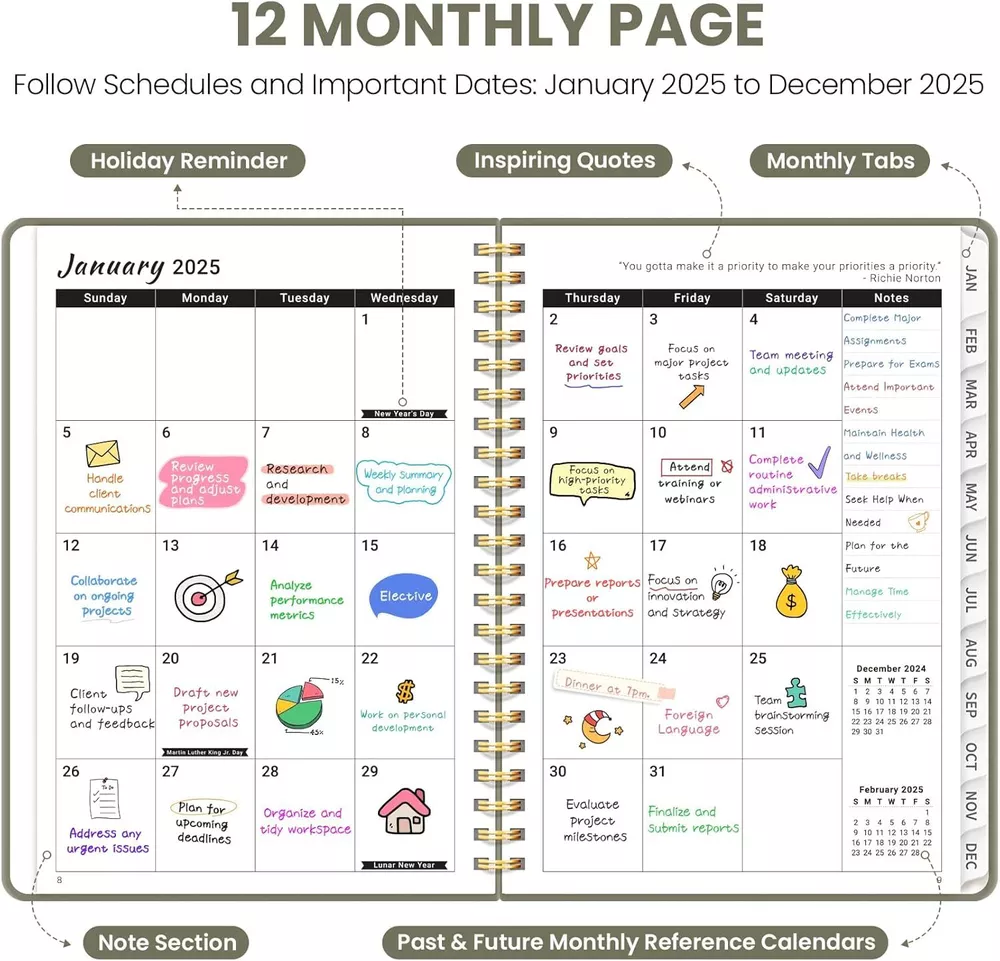 2025 Planner, Weekly and Monthly Calendar January 2025 - A.Green Start 2025 with Purpose : Embrace the new year with confidence using our ZOTIA 2025 Planner! Designed to cover January through December, this planner perfectly balances monthly and weekly layouts. At a convenient 6.3" x 8.5", it’s the ideal companion for tracking work goals, appointments, and daily priorities with precision and purpose. Effortless Monthly Planning : Stay organized and ahead of the curve with spacious daily blocks and holiday reminders on each monthly spread. Access past and future reference calendars, ensuring you have all the tools for seamless long-term planning right at your fingertips. Streamlined Weekly Organization : Achieve your weekly goals with ease! Each weekly page offers ample lined space for appointments, events, and to-do lists, complete with checkboxes to keep you on track. Celebrate your achievements as you navigate through the week.