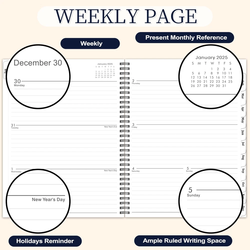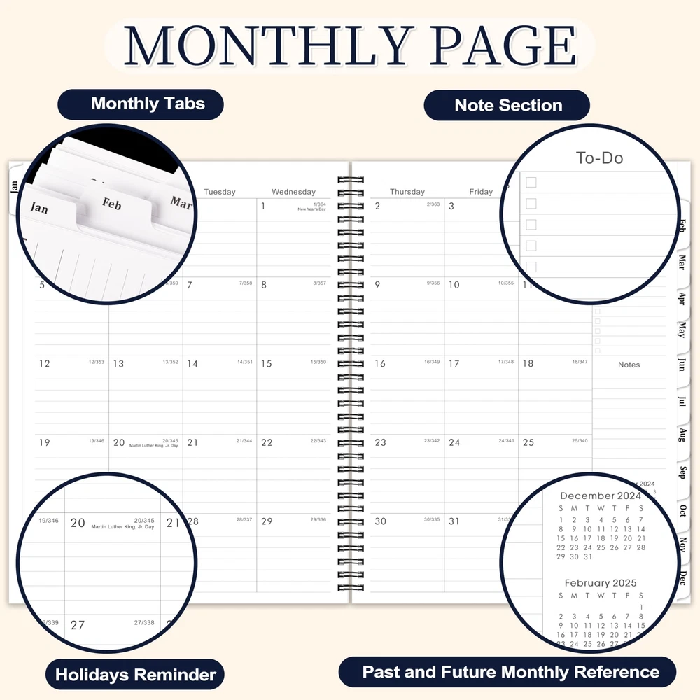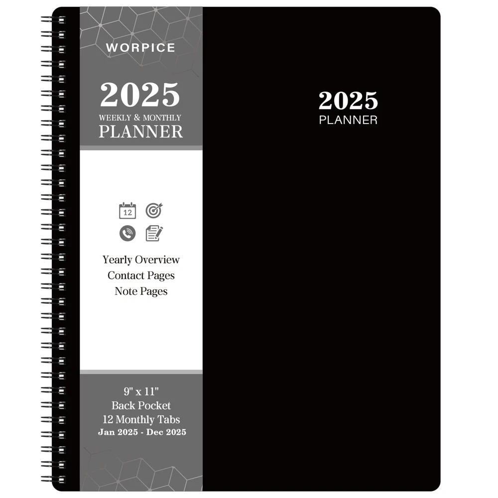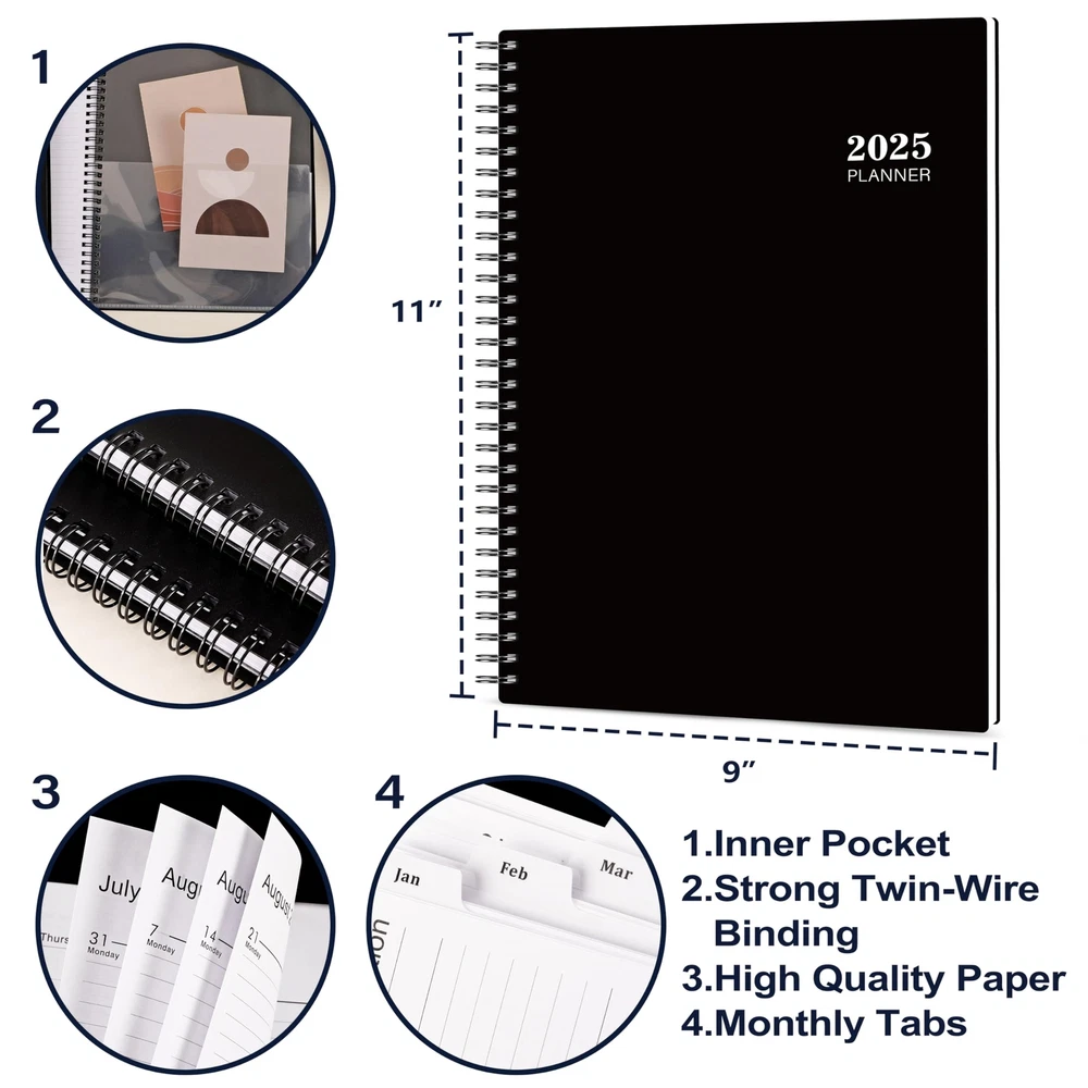 πŸ–Š2025 PLANNER - This weekly monthly planner planner is from January 2025 to December 2025, 9” Γ— 11”(A4 Size), featuring 12 monthly pages and 53 weekly pages with ample writing space for easy year planning and scheduling in 2025. πŸ–ŠINK BLEED RESISTANCE - The weekly monthly planner 2025, is made of premium paper, which is designed for superior ink bleed resistance, so you can plan your schedule and make long-term plans in monthly view pages without fear of bleeding through. πŸ–ŠDURABLE EASY TO USE - The 2025 academic planner has a flexible and water resistant black cover, can withstand constant use throughout the year. With strong twin-wire binding and easy-to-turn pages, you can lay the planner flat easily and write ideas on it at anytime anywhere. πŸ–ŠSTAY ORGANIZED - Plan your day, week, month or even an academic year with this 2025 weekly monthly planner 2025, you can get organized and prioritize your life. By setting goals at the begins of the year, you can keep track of your appointments, to do list everyday and manage and achieve your goals in 2025! πŸ–ŠGREAT GIFT CHOICE - With 12 monthly pages and 53 weekly pages, 12 monthly tabs, inner pocket, this 2025 calendar planner can be used for daily planning, writing notes, and carrying on-the-go to work, school, and home, which is a ideal gift choice for friends, students, teachers, kids, family members especially for busy person as birthday, anniversaries, Christmas, New Years gifts.