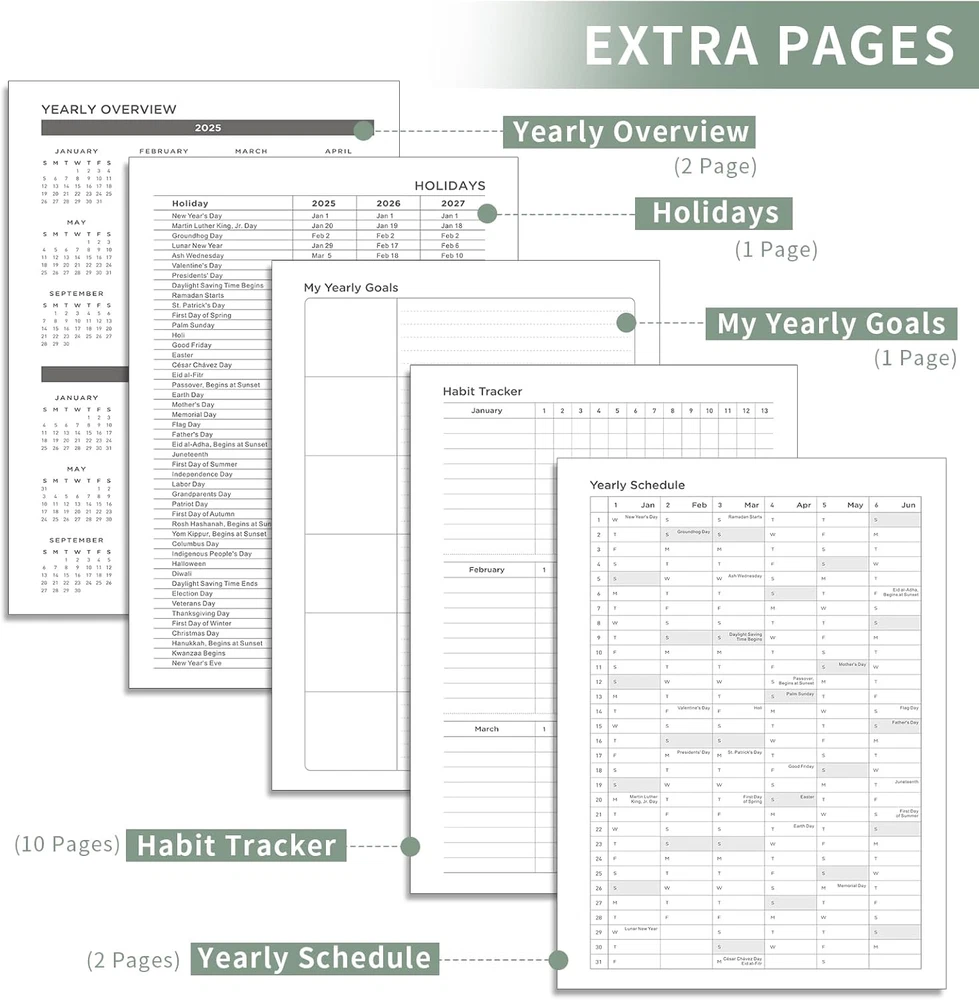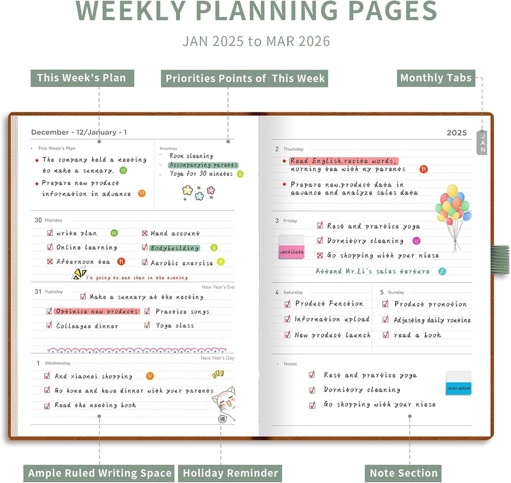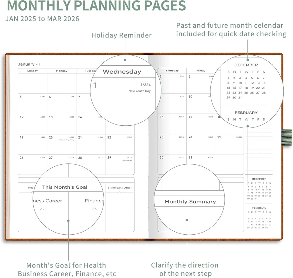 Store New Arrivals Add to Favorite View Feedback Contact Fast deliveries to the customer's home Quality customer service John Make the customers happy! 2025 Planner, Weekly and Monthly Planner 2025-2026, Calendar Planner 15-Months Jan 2025 - Mar 2026, Large A4 8.5"X11", with 14 Notes Pages, Vegan Leather Softcover, Inner Pocket, Sage Green Description 2025 PLANNER: AHGXG 2025-2026 Planner spans 15 months, December 30th and 31st of 2024 and spanning from January 2025 to March 2026. The large A4 size (8.5"x11") gives you plenty of planning room to let your organization flow freely MONTHLY Calendar View: Each month spans two full pages, featuring unruled daily blocks with reminders for US holidays, offering ample space for daily scheduling. The month's goals and summary provide clarity for the next steps. Reference calendars for the previous and next month facilitate easier year-round planning and tracking, making it ideal for long-term organization WEEKLY PLANNING: Each week includes sections for priorities, notes, and ample lined writing space. It allows you to write down your daily to-do list, important appointments, ideas, and more, ensuring efficient organization and productivity COMPREHENSIVE PLANNING: This 2025 planner covers everything you need for year-round planning, including Yearly Overview & Schedule, Important Dates, Holidays, Habit Tracker, Yearly Goals, Month Summary, Note Pages, Address Book, Password Organizer, and US time zone map. Special sections facilitate comprehensive planning, while Sticky Notes Divider simplify navigation PROFESSIONAL DESIGN: 2025-2026 Planner to take charge of your schedule with timeless elegance. Crafted with a premium simulated leather soft cover, tight sewn binding, and 100gsm thick paper, it ensures durability for prolonged use. Additionally, it features an inner pocket to conveniently store miscellay, keeping all essentials within reach Product Description 1 MONTHLY CALENDAR 2 WEEKLY PLANNING 3 YEARLY SCHEDULE 4 YEARLY OVERVIEW&HOLIDAYS 5 EXTRA PAGES We cordially invite you to click and explore further the AHGXG Planner Add to Cart Add to Cart Add to Cart Add to Cart Add to Cart Add to Cart Customer Reviews 4.6 out of 5 stars 586 4.5 out of 5 stars 120 4.1 out of 5 stars 19 4.3 out of 5 stars 30 4.6 out of 5 stars 586 4.5 out of 5 stars 120 — Price $9.99 $ 9 . 99 $6.99 $ 6 . 99 $5.99 $ 5 . 99 $6.99 $ 6 . 99 $14.99 $ 14 . 99 $6.99 $ 6 . 99 — Year JAN 2025 - MAR 2026 JAN 2025 - MAR 2026 JAN 2025 - DEC 2025 JAN 2025 - DEC 2026 JAN 2025 - MAR 2026 JAN 2025 - MAR 2026 JAN 2025 - DEC 2025 Type Weekly and Monthly Planner Weekly and Monthly Planner Weekly and Monthly Planner Monthly Planner 2025-2026 Weekly and Monthly Planner Weekly and Monthly Planner Weekly and Monthly Planner Size A4(8.5"x11") A6(3.9"x6.7") A5(6" x 8.38") A6(3.9"x6.7") A4(8.5"x11") A6(3.9"x6.7") A5(6" x 8.38") Cover Material Leather Softcover Leather Hardcover Cardboard Leather Hardcover Leather Softcover Leather Hardcover Cardboard Monthly Tab ✔ ✔ ✔ ✔ ✔ ✔ ✔ Inner Pocket ✔ ✔ ✔ ✔ ✔ ✔ ✔ Sheet Size 8.5 X 11 Inches Calendar Type Weekly and Monthly Format Organizer, Address Book, Student Calendar Paper Size 8.5 X 11 Inches Color Green Binding Leather Bound Cover Material Faux Leather Material Faux Leather, Paper Material Type Faux Leather, Paper Additional Features Bookmarks, Elastic Closure, Inner Pocket, Monthly Tabs, Sticky Notes Divider Target Audience Teacher, Adult, Traveler, Homemakers, Student Year 20242025 Recommended Uses For Product Planning, organizing daily tasks, and setting goals Model Year 20242025 Item Dimensions L x W 11"L x 8.49"W ABOUT US We offer the best prices around on high quality products. Our E-store includes media such as books, movies, music and games while offering electronics, toys, sporting apparel, clothing, tools, general home, garden items and more. SHIPPING We are always working hard to ensure your package arrives as soon as possible. Please understand that some factors like weather, high postal traffic, and the performance of shipping companies are outside of our control. We offer free shipping to the lower 48 states and ship within 2 business days of payment, usually sooner. We do not accept P.O. Boxes. Please provide a physical address. For shipping outside of the continental USA, we only use eBay's Global Shipping Program. The item is shipped to KY and then sent to the rest of the world. International customers are responsible for all duties and taxes. Continue to 'check out' to calculate costs for shipping the item to your country. Messages regarding eBay's Global Shipping Program MUST be directed at eBay EXCLUSIVELY. RETURNS We offer a 30-Day Return Policy on items in which you are not completely satisfied with. You have the option of a full-refund or an exchange of the item. No returns are available on items shipped outside of the USA PAYMENT We accept PayPal. CONTACT US This page content is yet to come Please ad us to your favorite seller and visit again later Thank You CUSTOMER SATISFACTION We try our very best to make sure every customer is completely satisfied. If there's a problem, message us! We're happy to help. WE ACCEPT