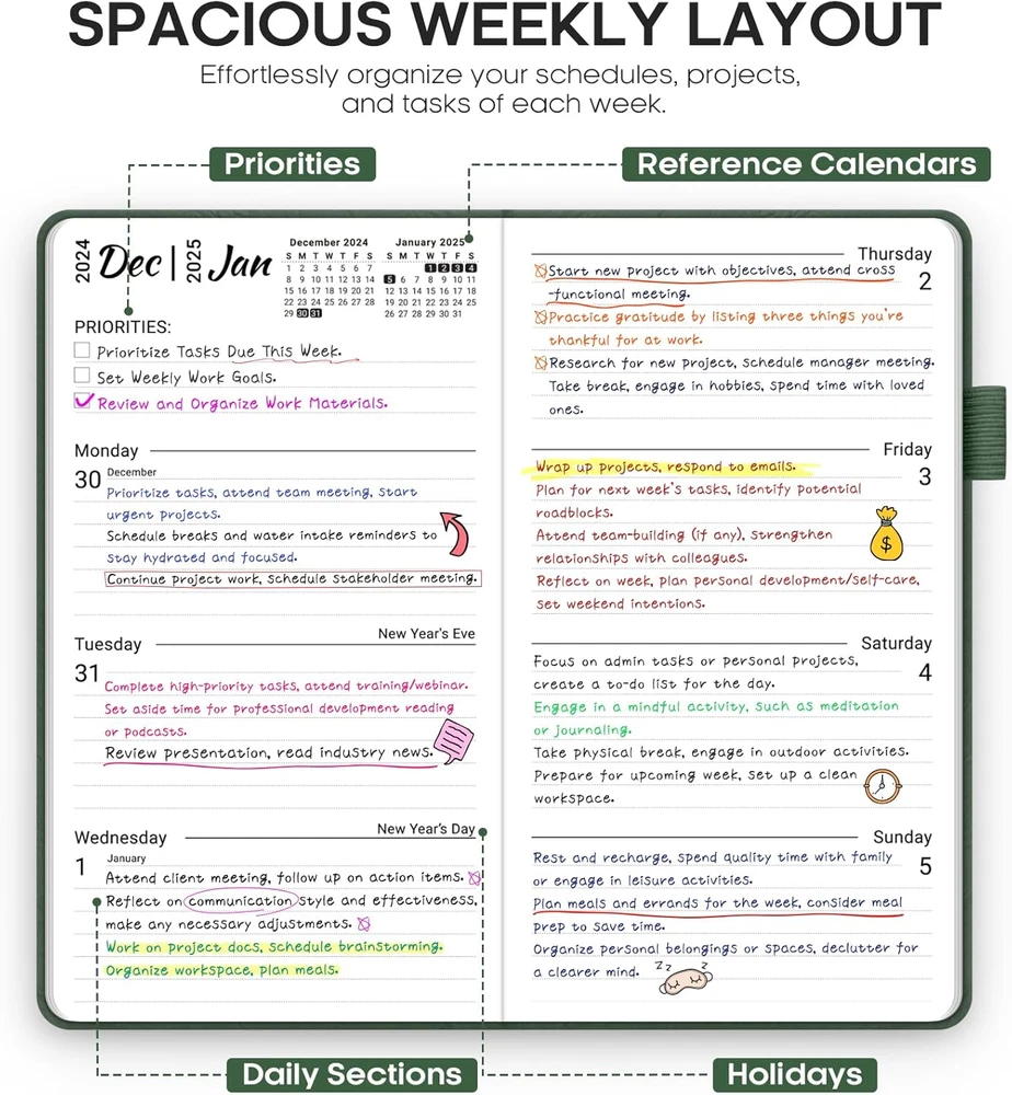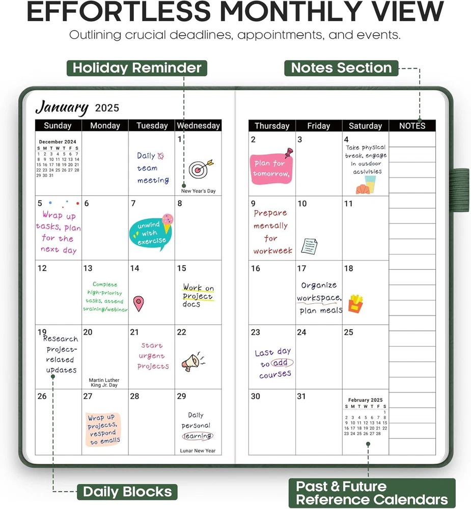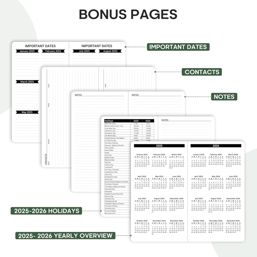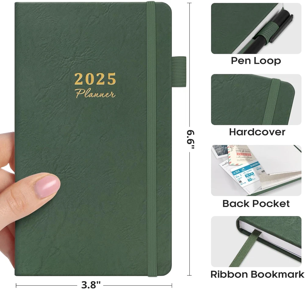 Menu Other Items Feedbacks About Us Contact Us Add To Favorites 2025 Pocket Planner, Weekly and Monthly Planner Runs from Jan 2025 to Dec 2025, Hardcover 2025 Calendar Planner Book with Tabs, Inner Pocket, Ideal for Office Home School Supplies, A6 Pocket Purse Mini Size (3.8" X 6.6") - Green 12 Months of Efficient Event Tracking: This 2025 pocket planner covers 12 months from January 2025 to December 2025. Compact and easy to carry, it's perfect for noting important dates and upcoming events. Stay organized and boost your productivity with this handy tool. Monthly Calendar Pages: Each monthly page features daily blocks and a notes section, including major holidays and public dates. The 2025 planner also includes past and future reference calendars to help you review and plan more effectively. Thoughtful Weekly Section: The weekly view pages offer blank space for daily plans, appointments, and events, with major holidays noted. A priorities section at the top helps you focus on key goals. The weekly view lets you organize all your tasks, making you feel accomplished with each completed item. Perfect Portable Mini Size: Measuring just 3.8" x 6.6", this pocket 2025 planner fits perfectly in your hand or purse. Its size makes it an excellent travel companion, ensuring you never forget your plans or miss an opportunity to jot down new events. It easily fits into any purse, backpack, messenger bag, or pocket, helping you plan all events for the upcoming 2025 year. Long-lasting Quality & Extras: Printed on premium thick paper for smooth writing, this mini 2025 planner's hardcover design ensures durability. Practical features like an elastic closure and bookmark add convenience. It includes a list of major holidays for 2025-2026, reference calendars, contact pages, and notes sections, making it perfect for office workers, students, teachers, and family members. Product Description Planners & Notebook by ZOTIA Add to Cart Add to Cart Add to Cart Add to Cart Add to Cart Customer Reviews 4.3 out of 5 stars 26 4.8 out of 5 stars 19 4.6 out of 5 stars 14 4.8 out of 5 stars 19 4.6 out of 5 stars 14 4.7 out of 5 stars 336 Price $5.94 $ 5 . 94 $5.99 $ 5 . 99 $5.99 $ 5 . 99 $6.99 $ 6 . 99 $7.99 $ 7 . 99 $5.94 $ 5 . 94 Size 6.3" x 8.5" 6.3" x 8.5" 6.3" x 8.5" 6.3" x 8.5" 6.3" x 8.5" 5.5" x 8.5" Quantity 140 Pages / 70 Sheets 140 Pages / 70 Sheets 140 Pages / 70 Sheets 140 Pages / 70 Sheets 140 Pages / 70 Sheets 140 Pages / 70 Sheets Paper Weight 100 gsm 100 gsm 100 gsm 100 gsm 100 gsm 100 gsm Year Jan 2025-Dec 2025 Jan 2025-Dec 2025 Jan 2025-Dec 2025 Jan 2025-Dec 2025 Jan 2025-Dec 2025 Undated Format Weekly & Monthly Weekly & Monthly Weekly & Monthly Weekly & Monthly Weekly & Monthly Undated Item Specification Item model number Z016-A6-Green Sheet Size A6 Inches Calendar Type Weekly & Monthly Color B-Green Cover Material Faux Leather Material Paper Material Type Paper Manufacturer Part Number Z016-A6-Green Pages 160 Pages Item Weight 5.92 ounces Product Dimensions 6.61 x 3.78 x 0.64 inches Year 2025 Target Audience Teacher, Adult, Student, Teen Size A6 (3.8" x 6.6") Dimensions Shipping Returns Additional Info Product Dimensions: 3.78 inches x 6.61 inches x 0.64 inches. Weight: 5.92 oz Fast shipping is very important for us. Our standard shipping service is FREE. Your order will be shipped within 1-3 business days upon full payment received. Most items are delivered within 3-5 business days, however, please allow 3-10 business days. We are shipping only to USA. We only ship to the confirmed Paypal address. We reserve the right to cancel any order for any reason at any time. We are not responsible for undeliverable addresses. We offer a 30 day return policy from checkout winning date. Your satisfaction is guaranteed! If for any reason you are unhappy with your item, just return it within 30 days for a full refund, minus shipping cost. Please contact us prior to initiating a return so that we can issue you a refund authorization. Items defective upon receipt must be packaged in their retail packaging as if new and returned with a detailed description of the problem. Return shipping fees are not refundable. We reserve the right to decline any returns if the above guidelines are not followed. All of our items, unless otherwise stated, will only run on 120 volts. Please check to make sure your country complies with these specifications. If you have a problem or question regarding your transaction please contact us before leaving any type of feedback. We will work with you to resolve any problem you may have.
